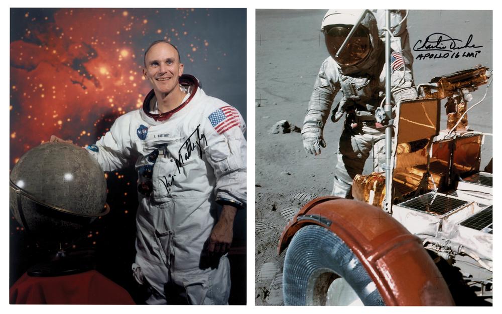 Two color 8 x 10 photos of Apollo 16 astronauts, Charlie Duke and Ken Mattingly, semi-glossy and satin-finish, one showing Duke near the lunar rover during a mission EVA, signed in black felt tip, “Charlie Duke, Apollo 16 LMP,” and the other of Mattingly in his white space suit with a lunar globe and celestial backdrop, signed in black felt tip, “Ken Mattingly.” In overall fine condition. The Duke photo is accompanied by a 2008 'Astronaut Autograph Club' letter bearing his facsimile signature.