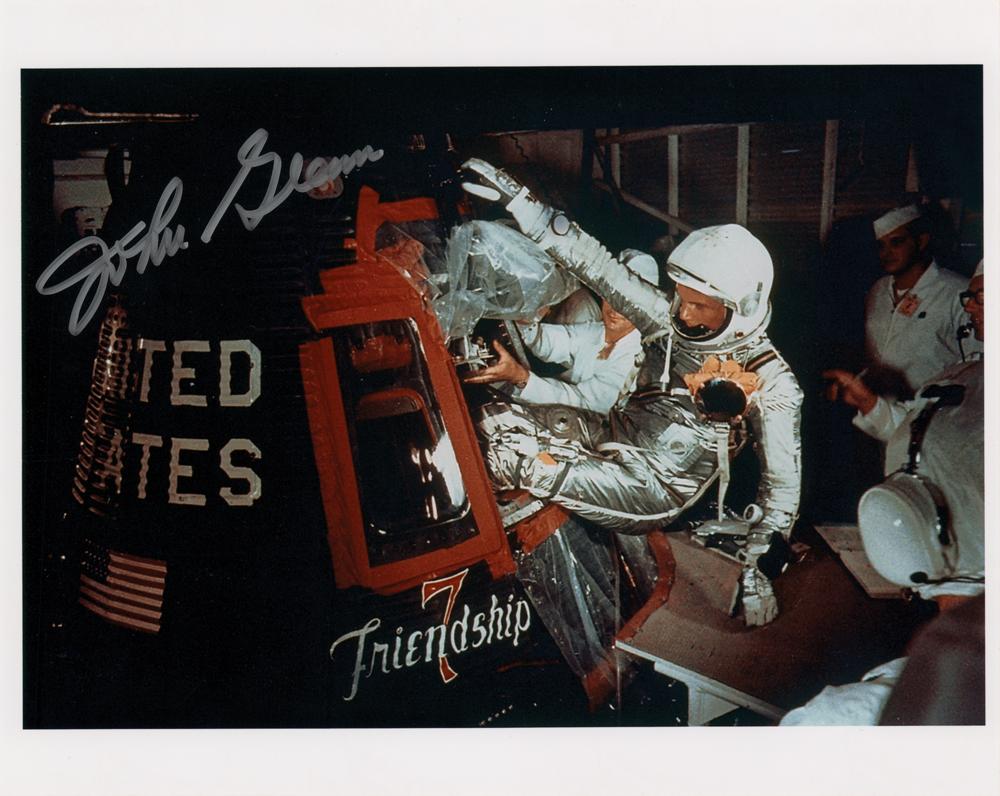 Color satin-finish 10 x 8 photo of Mercury astronaut John Glenn climbing into his Friendship 7 spacecraft, signed in silver ink. In very fine condition. Accompanied by a 2007 'Astronaut Autograph Club' letter bearing Glenn's facsimile signature.
