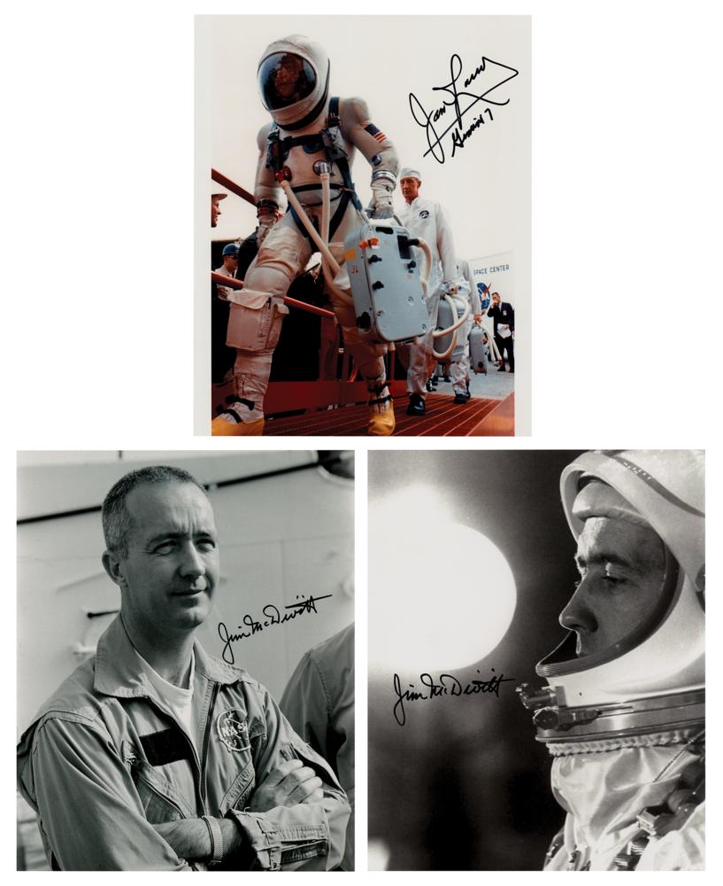 Three 8 x 10 photos of Gemini astronauts James Lovell and Jim McDivitt (2), semi-glossy and satin-finish, individually signed in black felt tip by the pictured spaceman. In overall fine condition. Each photo is accompanied by an 'Astronaut Autograph Club' letter bearing a facsimile signature.