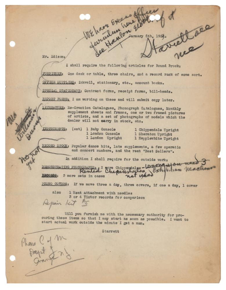 Handwritten notes in pencil by Thomas Edison, unsigned, annotated on a typed letter addressed to him by Edison Phonograph Company inspector/salesman Hal Starrett, one page, 8.5 x 11, January 5, 1922. Starrett solicits a request from Edison on “the following articles for Bound Brook,” asking for items like furniture, office supplies, and special stationery, amongst other things. All pencil notations above the “Phono Covers” section are in the hand of Edison, who responds to topics like furniture (“We have excess office furniture here, see Hanson”), literature (“Williams & Burns”), record stock (“no, not yet”), and demonstrating phonographs (“wrong, you need 3 rented Chippendales exhibition machines, not used”). In fine condition, with multiple file holes, and a few short edge tears.
