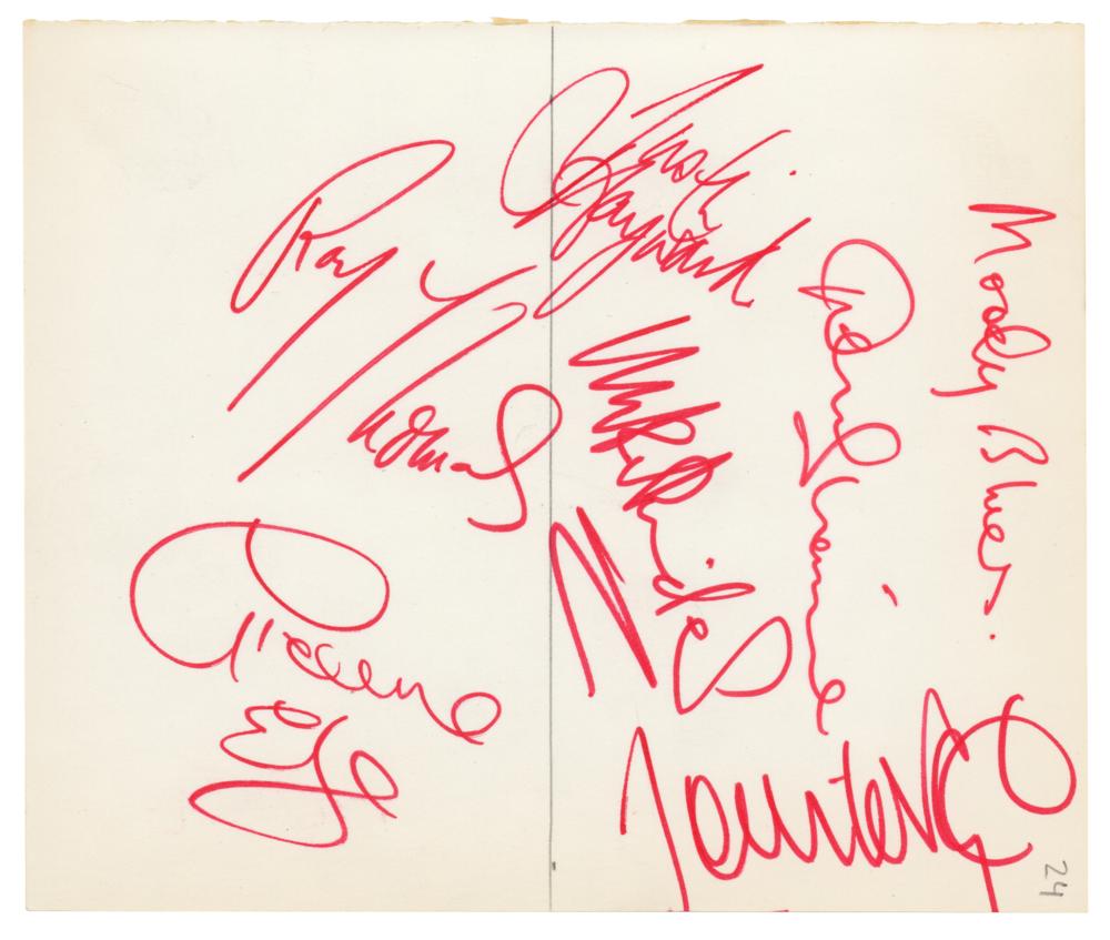 Red felt tip signatures of the Moody Blues — Graeme Edge, Mike Pinder, Ray Thomas, Justin Hayward, John Lodge, and Denny Laine, who adds “Moody Blues” — on an off-white 5.75 x 6.75 sheet. In fine condition.