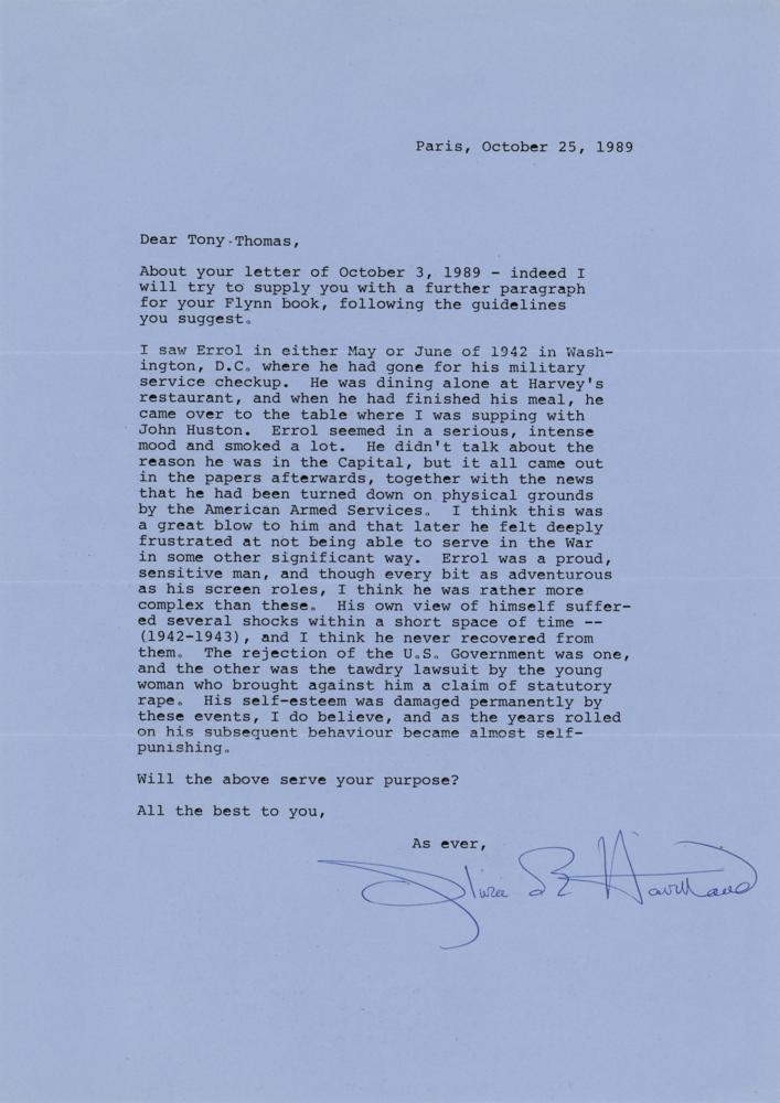 TLS, one page, 8.25 x 11.75, October 25, 1989. Letter to Errol Flynn biographer Tony Thomas, in full: “About your letter of October 3, 1989 - indeed I will try to supply you with a further paragraph for your Flynn book, following the guidelines you suggest. I saw Errol in either May or June of 1942 in Washington, D.C. where he had gone for his military service checkup. He was dining alone at Harvey's restaurant, and when he had finished his meal, he came over to the table where I was supping with John Huston. Errol seemed in a serious, intense mood and smoked a lot. He didn't talk about the reason he was in the Capital, but it all came out in the papers afterwards, together with the news that he had been turned down on physical grounds by the American Armed Services. I think this was a great blow to him and that later he felt deeply frustrated at not being able to serve in the War in some other significant way. Errol was a proud, sensitive man, and though every bit as adventurous as his screen roles, I think he was rather more complex than these. His own view of himself suffered several shocks within a short space of time — (1942-1943), and I think he never recovered from them. The rejection of the U.S. Government was one, and the other was the tawdry lawsuit by the young woman who brought against him a claim of statutory rape. His self-esteem was damaged permanently by these events, I do believe, and as the years rolled on his subsequent behaviour became almost self-punishing. Will the above serve your purpose?” In fine condition.