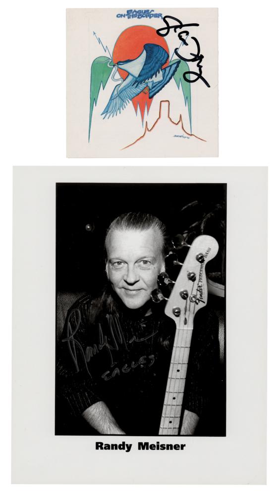 Two items: a semi-glossy 8 x 10 publicity photo of Randy Meisner posing with his bass guitar, signed in silver ink, “Randy Meisner, Eagles”; and a CD booklet for the Eagles album On the Border, signed in black felt tip, “Glenn Frey.” In overall very fine condition. The CD is not included. Accompanied by a certificate of authenticity from Beckett Authentication Services for the Meisner photograph.