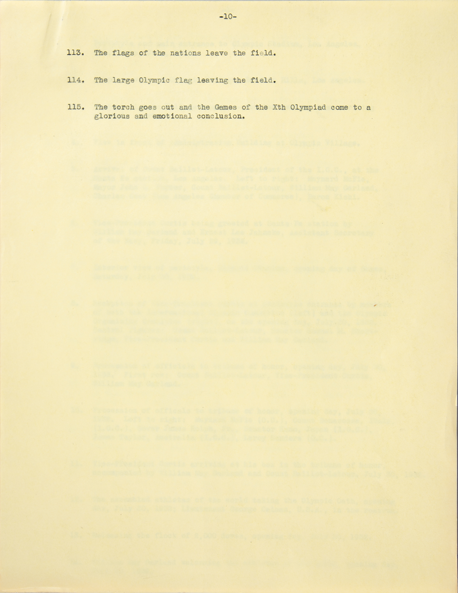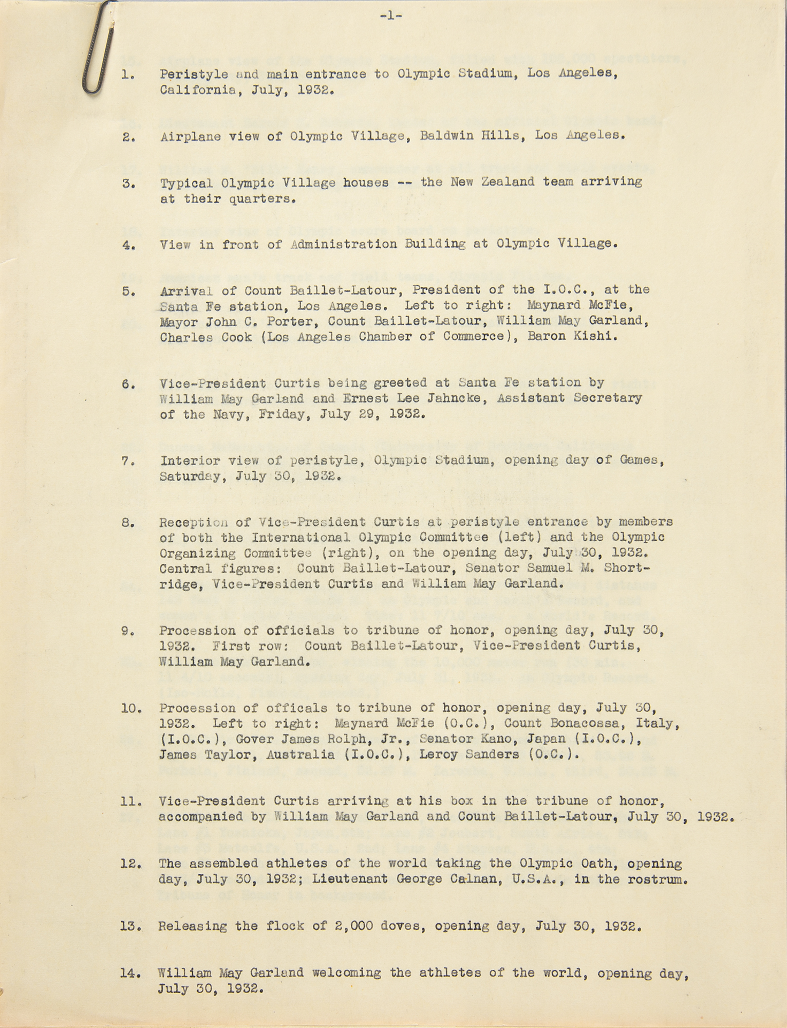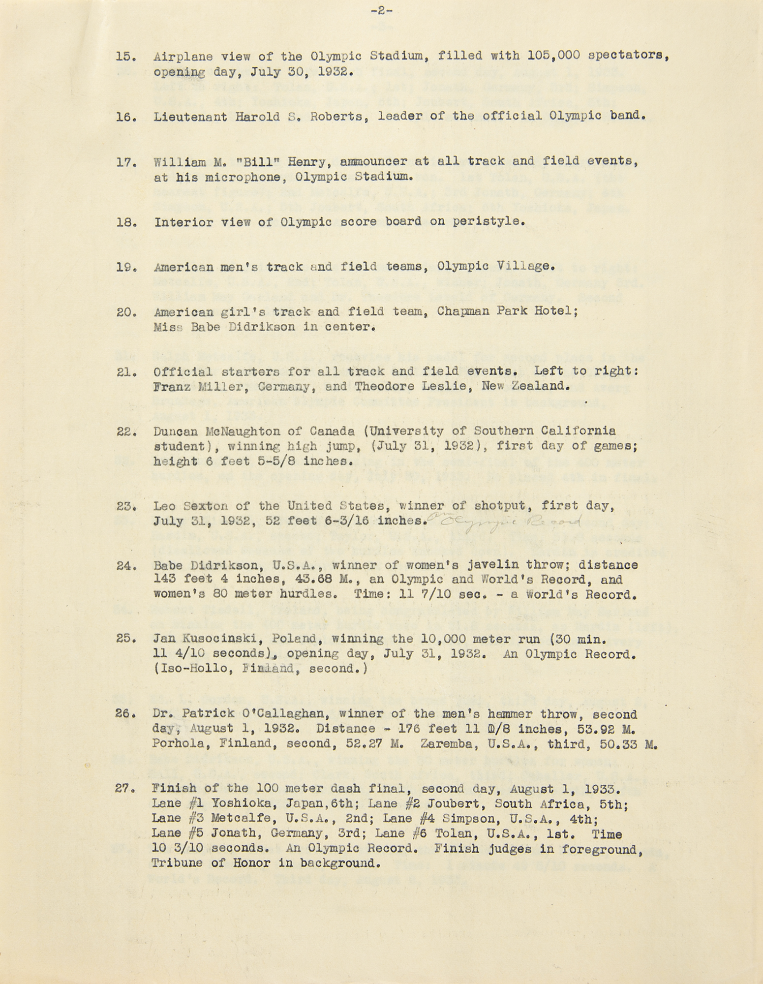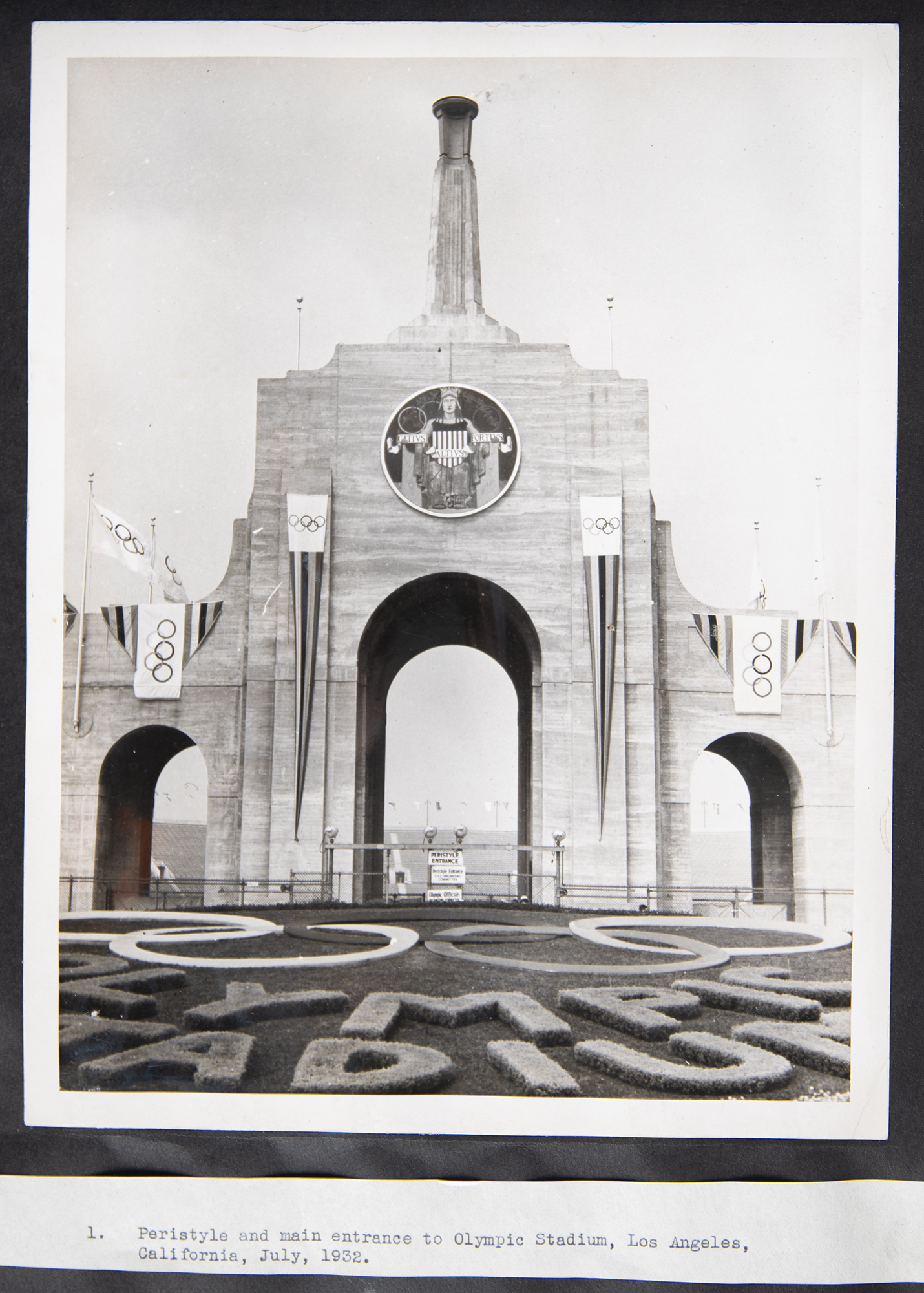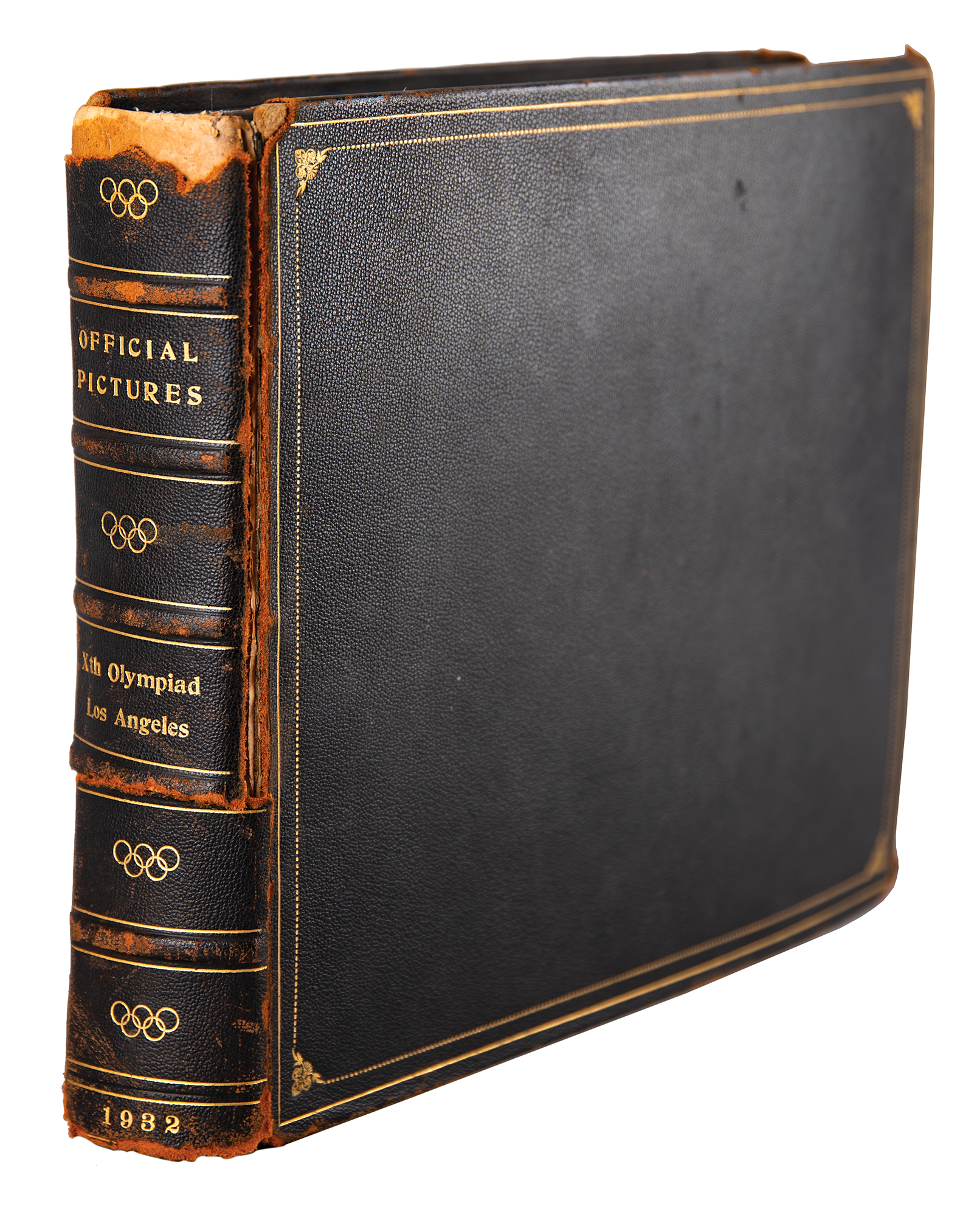 Rare custom-bound book with gilt-stamped title on the spine, "Official Pictures: Xth Olympiad, Los Angeles, 1932," evidently created for distribution to officials, media, and the press. The leatherbound volume measures 12.5 x 10.5, and contains 115 original silver gelatin press photos portraying the historic Olympiad, with views of the grounds, events, athletes, and officials. A ten-page typed guide to the photos is loosely inserted in the front, and each image is captioned below. In good to very good condition, with weak joints, splits to spine leather and chipping at spine's head, and worn corners.