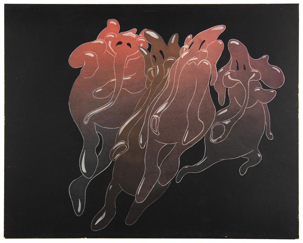 (Walt Disney Studios, 1941) Original concept painting of pink elephants from Dumbo, ostensibly done by Disney animator Maurice Noble, who worked on color coordination and character design for Dumbo, including the mesmerizing ‘pink elephant’ sequence. Accomplished in gouache on black 15.5 x 12.5 artist paper, the scene shows the four ‘bubble’ hallucinations from the perspective of Dumbo, who became inebriated after having accidentally drank champagne spilled into a circus water vat. The total image measures 11 x 11.5. In fine condition. An early imagining of a particularly surreal Disney moment.