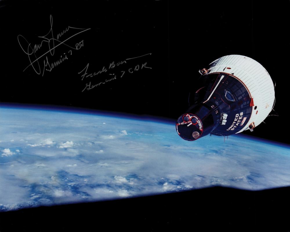 Color satin-finish 10 x 8 photo of the Gemini 6 capsule floating high above Earth, as viewed from the Gemini 7 spacecraft, signed in silver ink, "James Lovell, Gemini 7 PLT" and "Frank Borman, Gemini 7 CDR." In fine condition, with a tiny bend to the upper left corner tip.