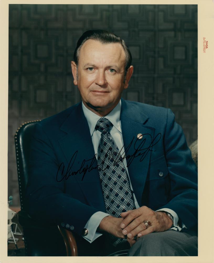 Desirable official color glossy 8 x 10 red-numbered NASA photo (S-71-57816) of the director of the Manned Spacecraft Center, signed in black ink, "Christopher C. Kraft, Jr." Reverse bears "A Kodak Paper" watermarks. In fine condition.