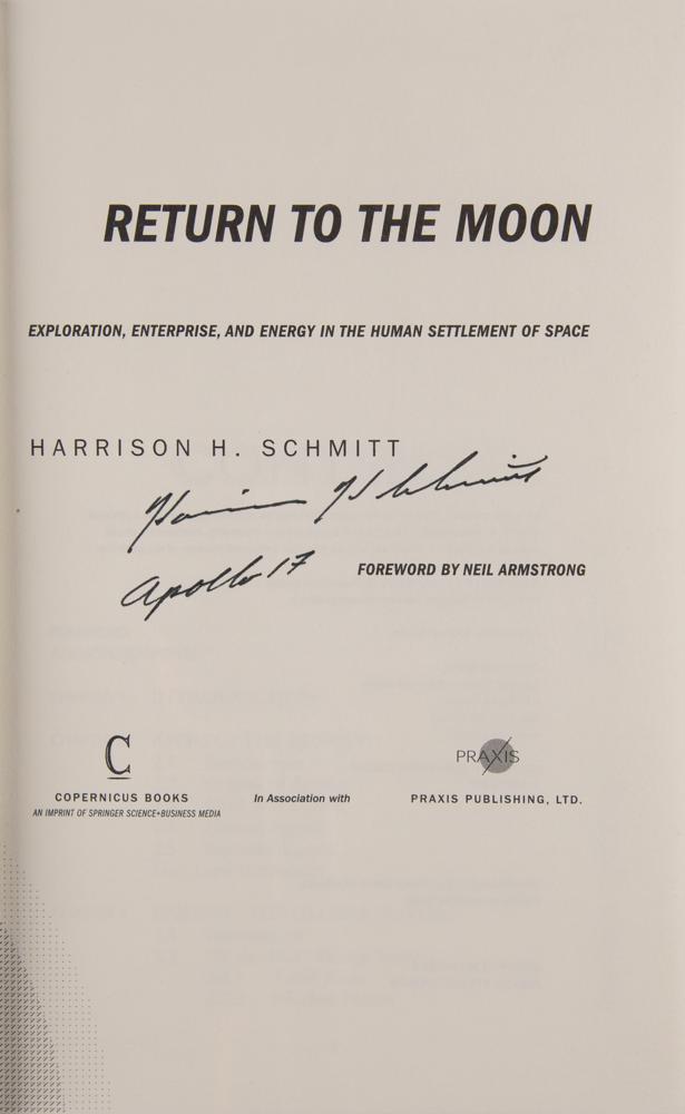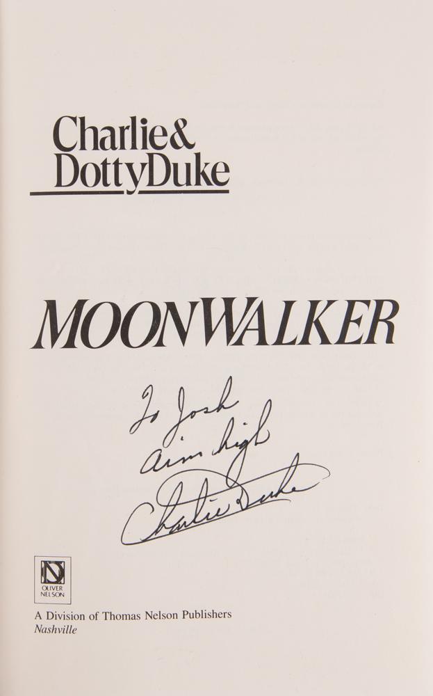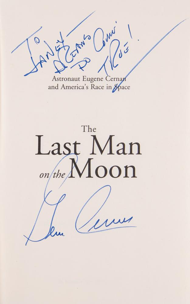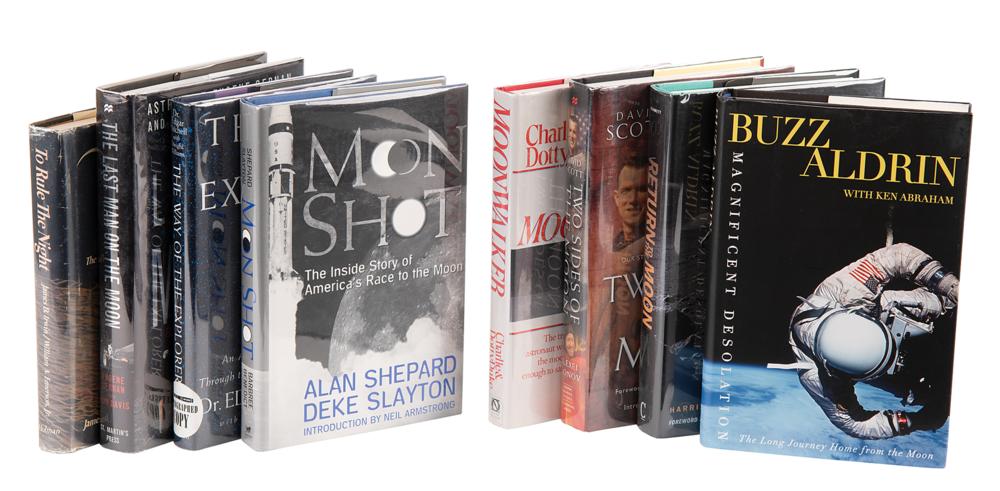 Collection of eight books, each hardcover with dust jacket, signed on an opening page in ink or felt tip by an Apollo moonwalker, including (some inscribed): Buzz Aldrin (Magnificent Desolation), Gene Cernan (The Last Man on the Moon), Charlie Duke (Moonwalker), Jim Irwin (To Rule the Night), Edgar Mitchell (The Way of the Explorer), Harrison Schmitt (Return to the Moon), Dave Scott (Two Sides of the Moon), and Alan Shepard (Moon Shot). In overall fine condition, with scattered wear to the dust jackets, including paper loss to To Rule the Night.