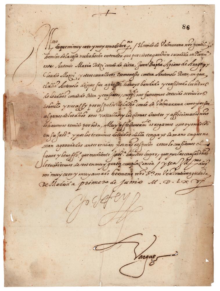 King of Spain (born 1527) from 1556 until his death in 1598; Sovereign of the Spanish Empire over North and South America, King of Portugal, Naples, Spanish Holland and Sicily, and King of England and Ireland while married to Queen Mary I. LS in Spanish, signed “Yo El Rey,” one page, 8.25 x 11.25, Madrid, June 1, 1566, with affixed official paper seal. Untranslated letter signed to "mi muy charo y muy amado hermano [my very dear and beloved brother]." In fine condition, with some light toning and soiling.