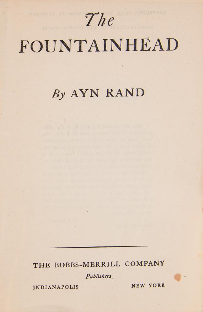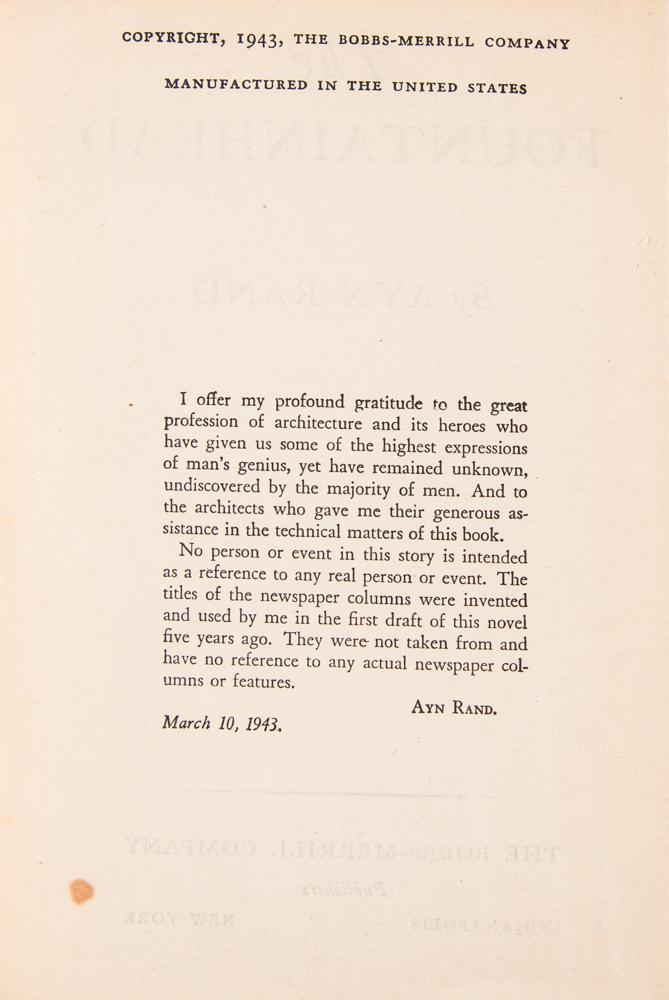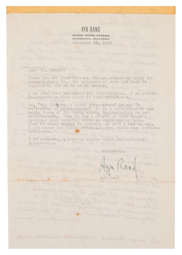 TLS, one page, 7.25 x 10.25, personal letterhead, November 29, 1946. Letter to Karl Wieger, in full: “Thank you for your letter. Please excuse my delay in acknowledging it. The pressure of work has made it impossible for me to do it sooner. I am glad that you liked THE FOUNTAINHEAD. I am always interested to hear about it from architects. No, ‘the dithyrambs about skyscrapers’ is not ‘a reflection of megalomania.’ It is a reflection of the basic theme of the book, which, incidentally, is not architecture. That is why I didn't go into Roark's troubles with building codes or registration laws. That is small change in relation to what I had to say. I did cover the basic principles from which such troubles originate. I am enclosing a printed letter which you may find interesting.” The letter is affixed to the front pastedown of an early hardcover printing of The Fountainhead, published by the Bobbs-Merrill Company in 1943; the referenced “printed letter,” an eight-page pamphlet entitled “A Letter from Ayn Rand, Author of The Fountainhead,” which was previously affixed inside the book, is included. The letter is in very good to fine condition, with a few small stains, old tape along the top edge, and some show-through from the correspondent's letter on the back. Book condition: G/None, with a sunned and cocked spine, and scattered staining to boards and textblock.