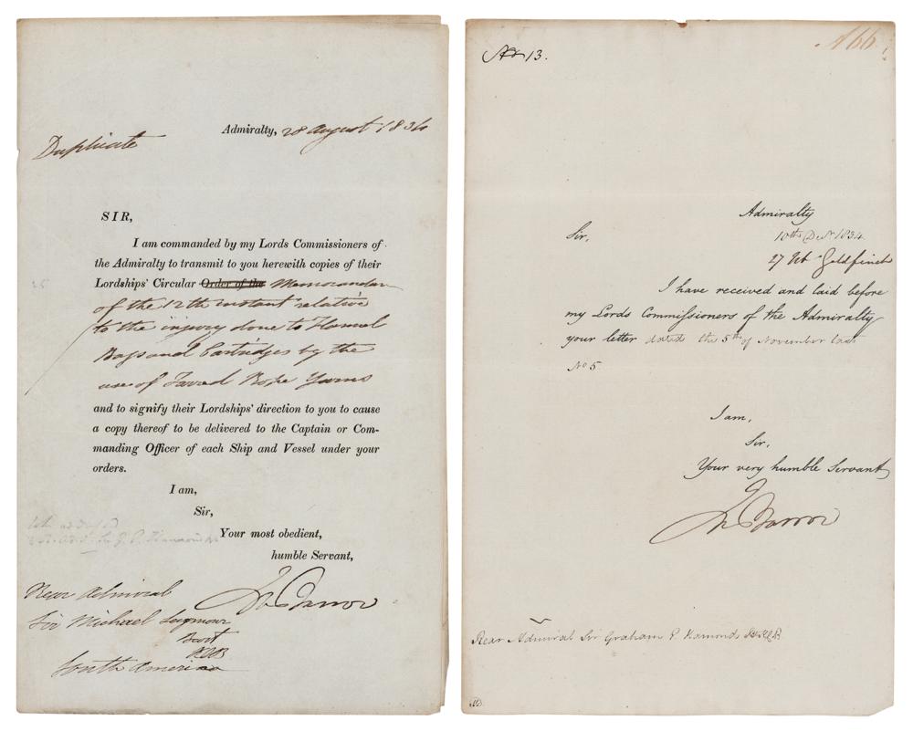 British naval administrator and explorer (1764-1848) who mapped the interior of South Africa and promoted the exploration of the Arctic; the Barrow Strait in northern Canada was named in his honor. Two partly-printed DSs, both one page, 8 x 13, and signed at the conclusion, “Jno. Barrow.” The earlier document, dated August 28, 1834, addressed to Rear Admiral Michael Seymour, regarding a circular related to “Bags and Cartridges”; the second, dated December 10, 1834, addressed to Rear Admiral Graham Hammond, affirming the receipt and transmission of his letter to “my Lords Commissioners of the Admiralty.” In overall fine condition.