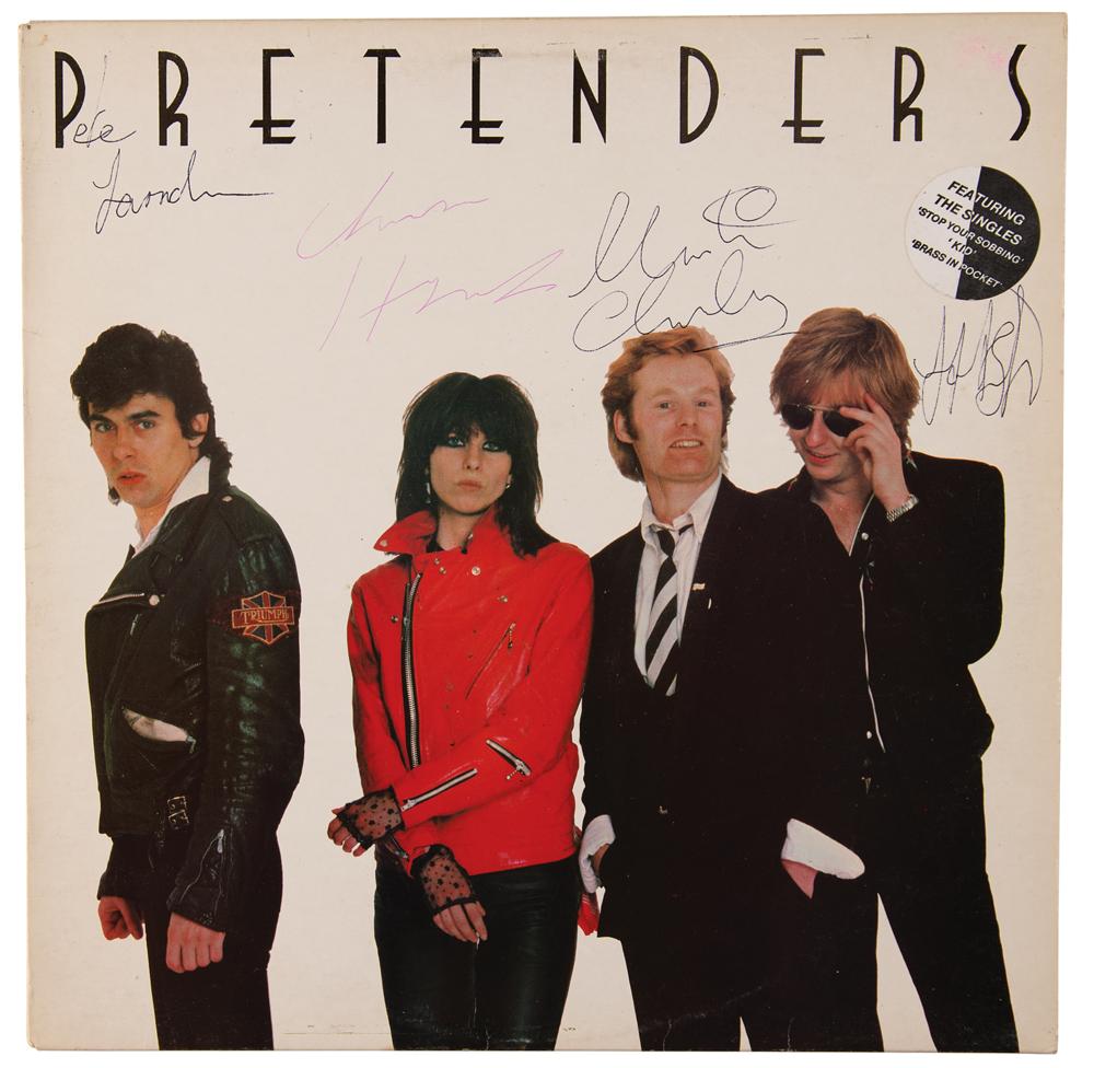 Self-titled debut album by The Pretenders, signed on the front cover in red ballpoint by Chrissie Hynde, and in black ballpoint by James Honeyman-Scott, Martin Chambers, and Pete Farndon. In fine condition. The record is included.