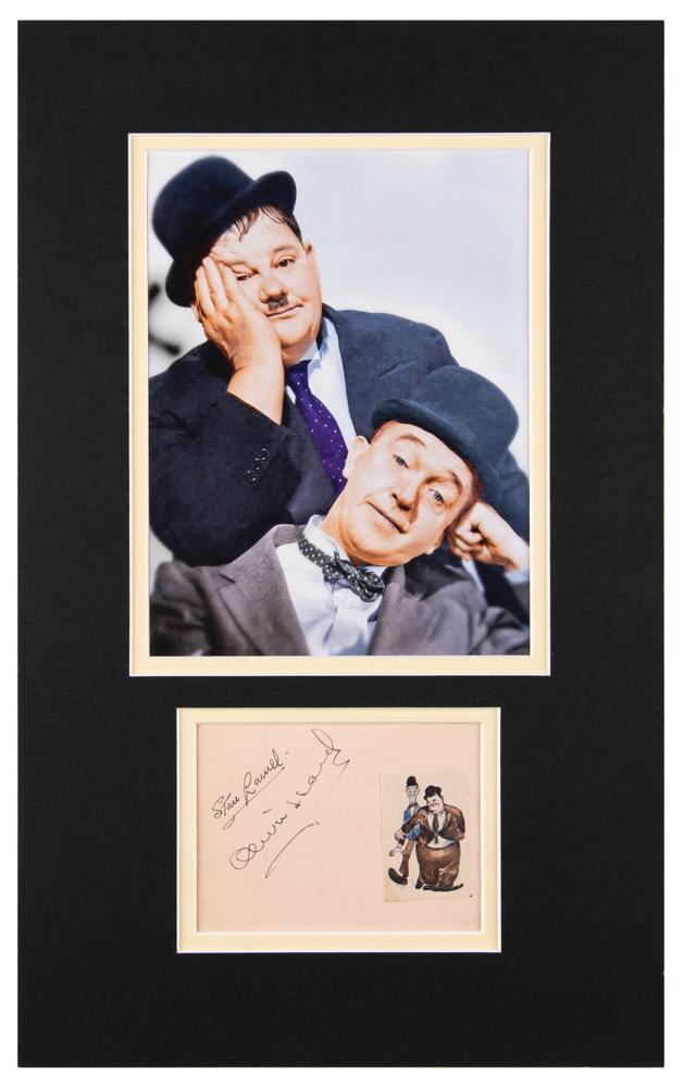 Vintage ink signatures, “Stan Laurel” and “Oliver Hardy,” on a peach-colored 4.25 x 3 album page with affixed cartoon image. Double-matted with a photo to an overall size of 9.75 x 15.75. In fine condition.