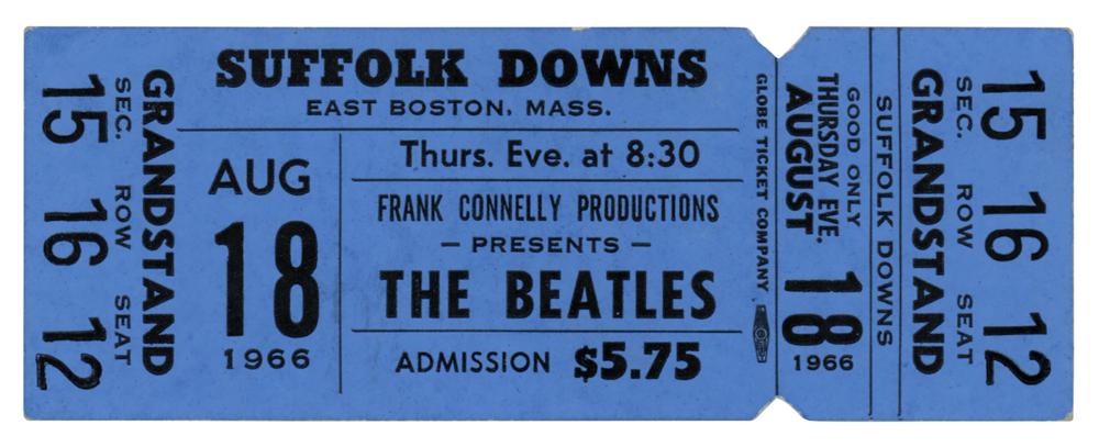 Unused 'blue' ticket for the Beatles concert at Suffolk Downs in East Boston, Massachusetts, on August 18, 1966, for admission to the grandstand. The ticket, measuring 4 x 1.5, is for "Sec. 15," "Row 16," and "Seat 12." In fine condition. These tickets were released in seven different colors.