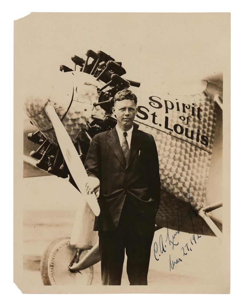 Vintage pearl-finish 6.5 x 8.5 photo of Charles Lindbergh posing outdoors with a hand on the propeller of his record-setting monoplane, the Spirit of St. Louis, signed in fountain pen, "C. A. Lindbergh, Mar. 27, 1928." In very good to fine condition, with light silvering to the darker areas of the image, light wrinkling, and two missing corner tips (easily matted out). On December 14, 1927, a Special Act of Congress awarded Lindbergh the Medal of Honor, despite the fact that it was almost always awarded for heroism in combat. It was presented to Lindbergh by President Coolidge at the White House on March 21, 1928, just six days before this photograph was signed.