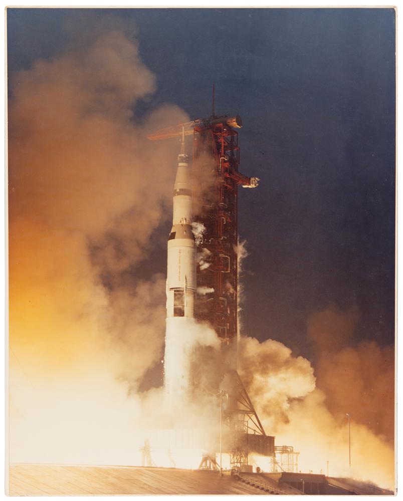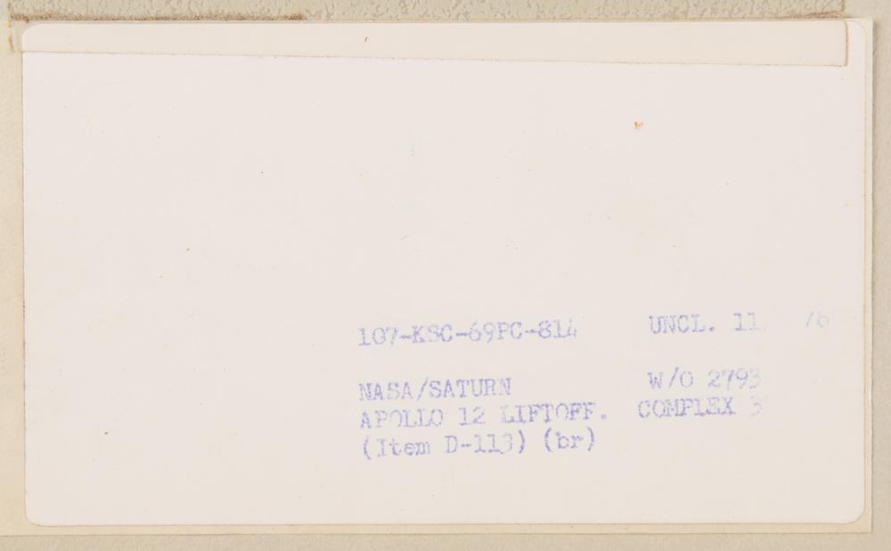 Original vintage color matte-finish 15.75 x 19.75 photograph of the Apollo 12 liftoff on the morning of November 14, 1969. Affixed to a slightly larger mount, with a period caption taped to the reverse. In fine condition.