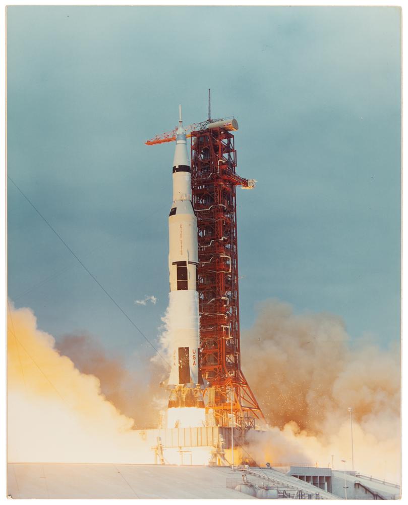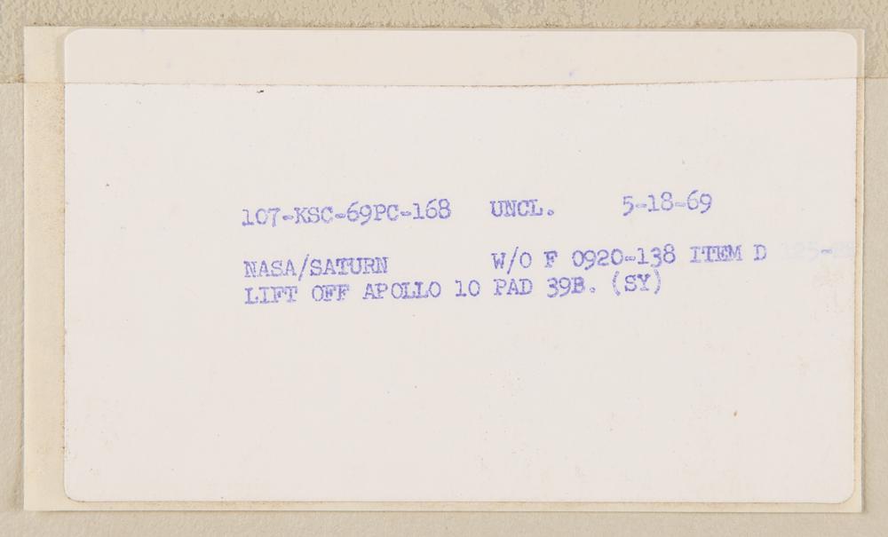 Original vintage color matte-finish 15.75 x 19.75 photograph of the Apollo 10 liftoff from Pad 39B on May 18, 1969. Affixed to a slightly larger mount, with a period caption taped to the reverse. In fine condition.