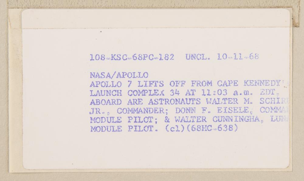 Original vintage color matte-finish 15.75 x 19.75 photograph of the Apollo 7 liftoff from Cape Canaveral's Launch Complex 34 on October 11, 1968. Affixed to a slightly larger mount, with a period caption taped to the reverse. In fine condition.
