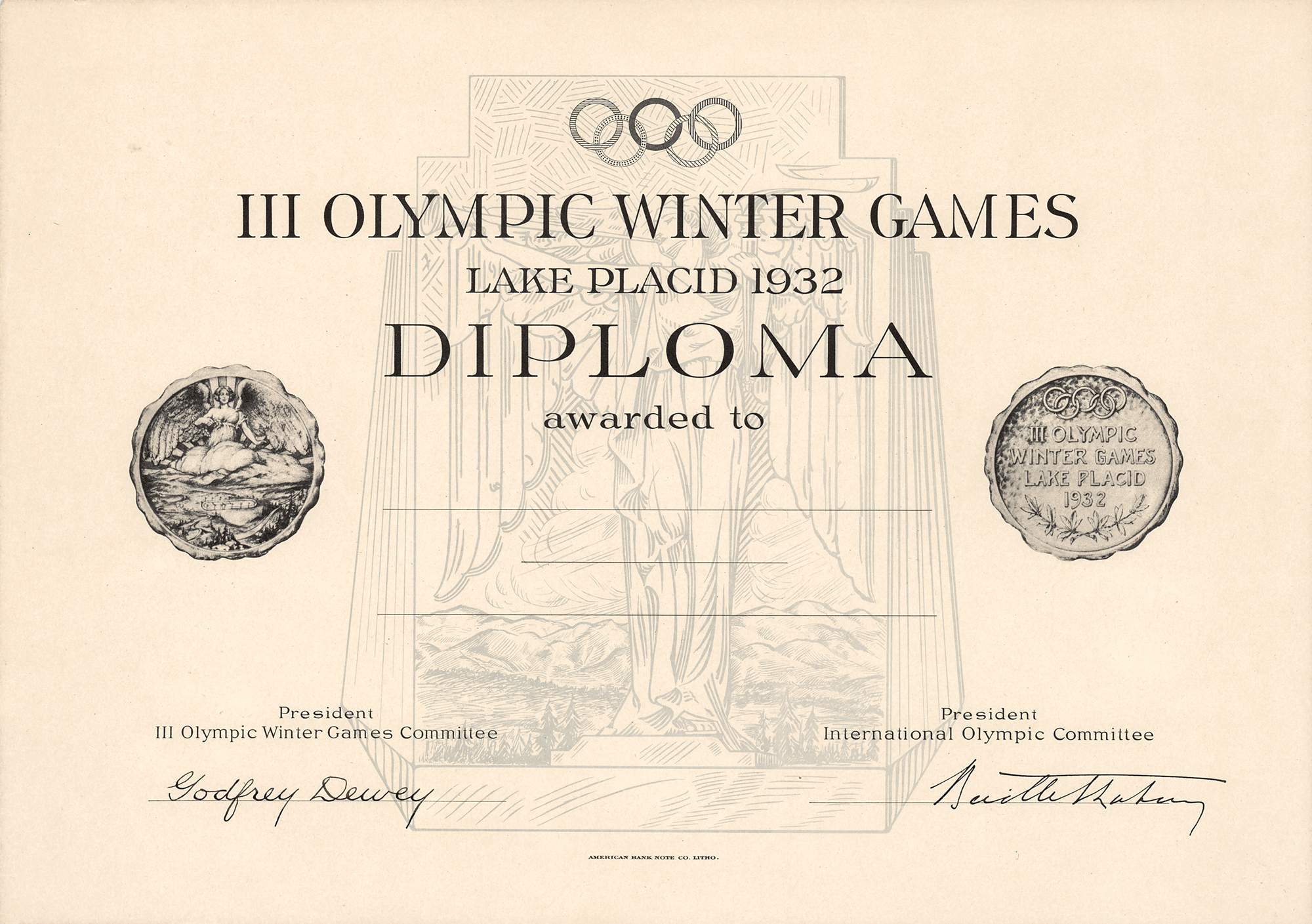 Official unissued diploma from the Lake Placid 1932 Winter Olympics, 14 x 10, which bears the facsimile signatures of the presidents of the III Olympic Winter Games Committee (Godfrey Dewey) and the International Olympic Committee (Baillet-Latour). In fine condition.