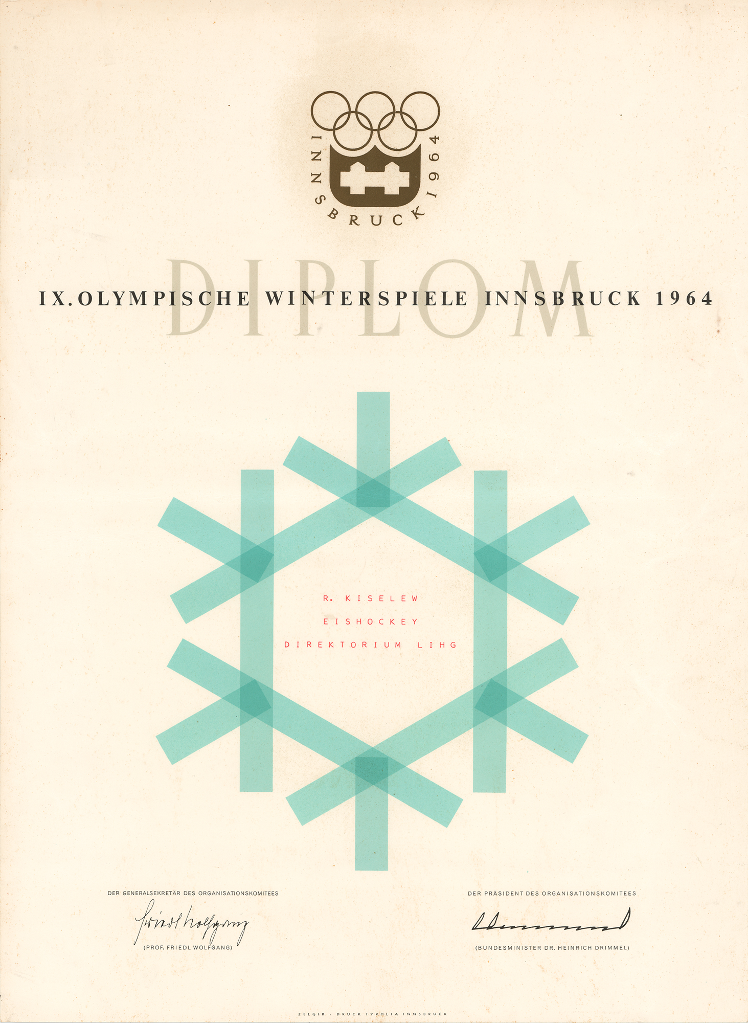 Official participant's diploma from the 1964 Innsbruck Winter Olympics issued to ice hockey organizer Roman Kiselev of the USSR, 13.5 x 18.5, featuring the logo of the Games at the top and a snowflake design in the center, with the facsimile signatures of organizing executives below. In very good to fine condition, with a light bend, and scattered creasing.