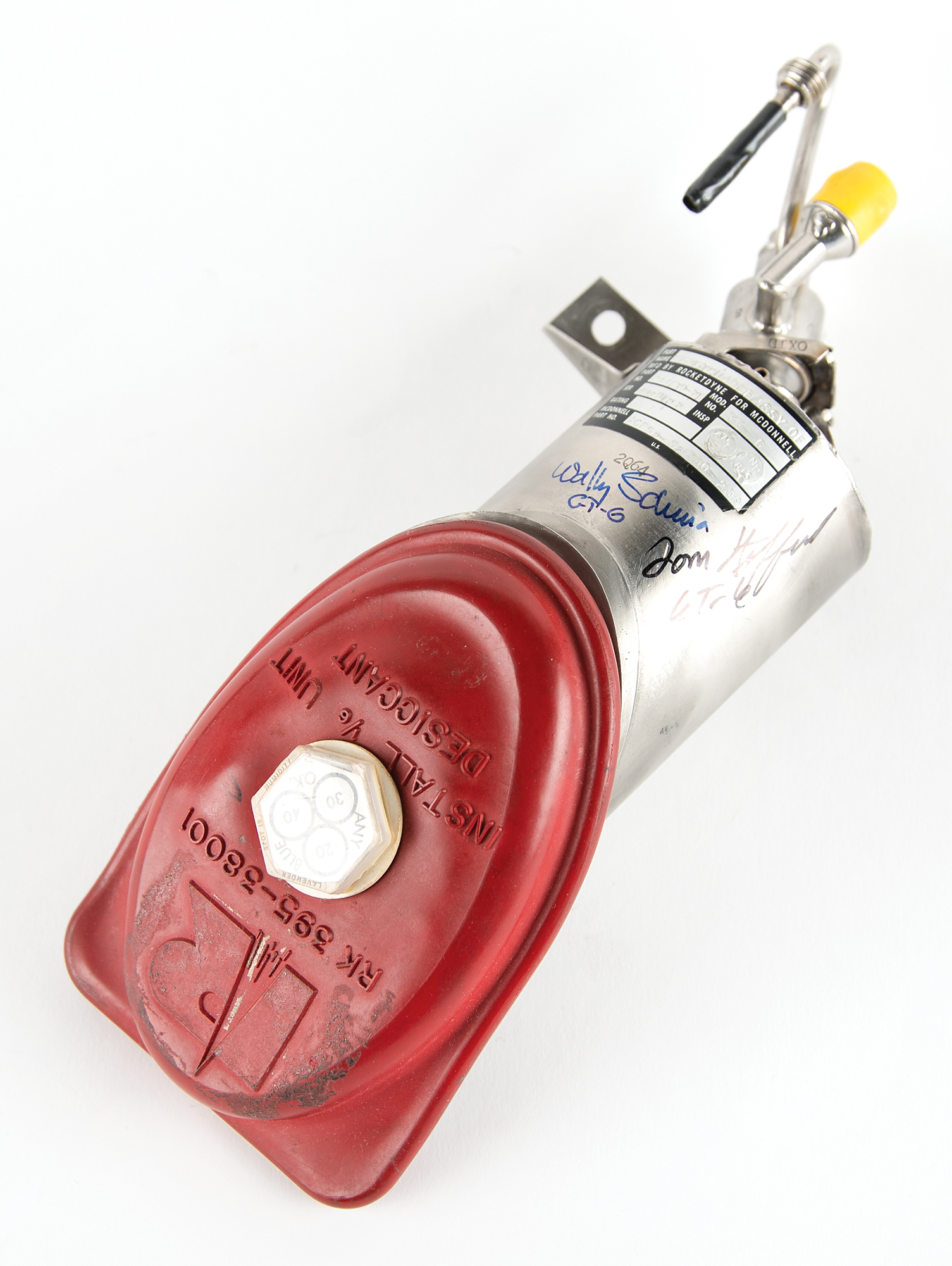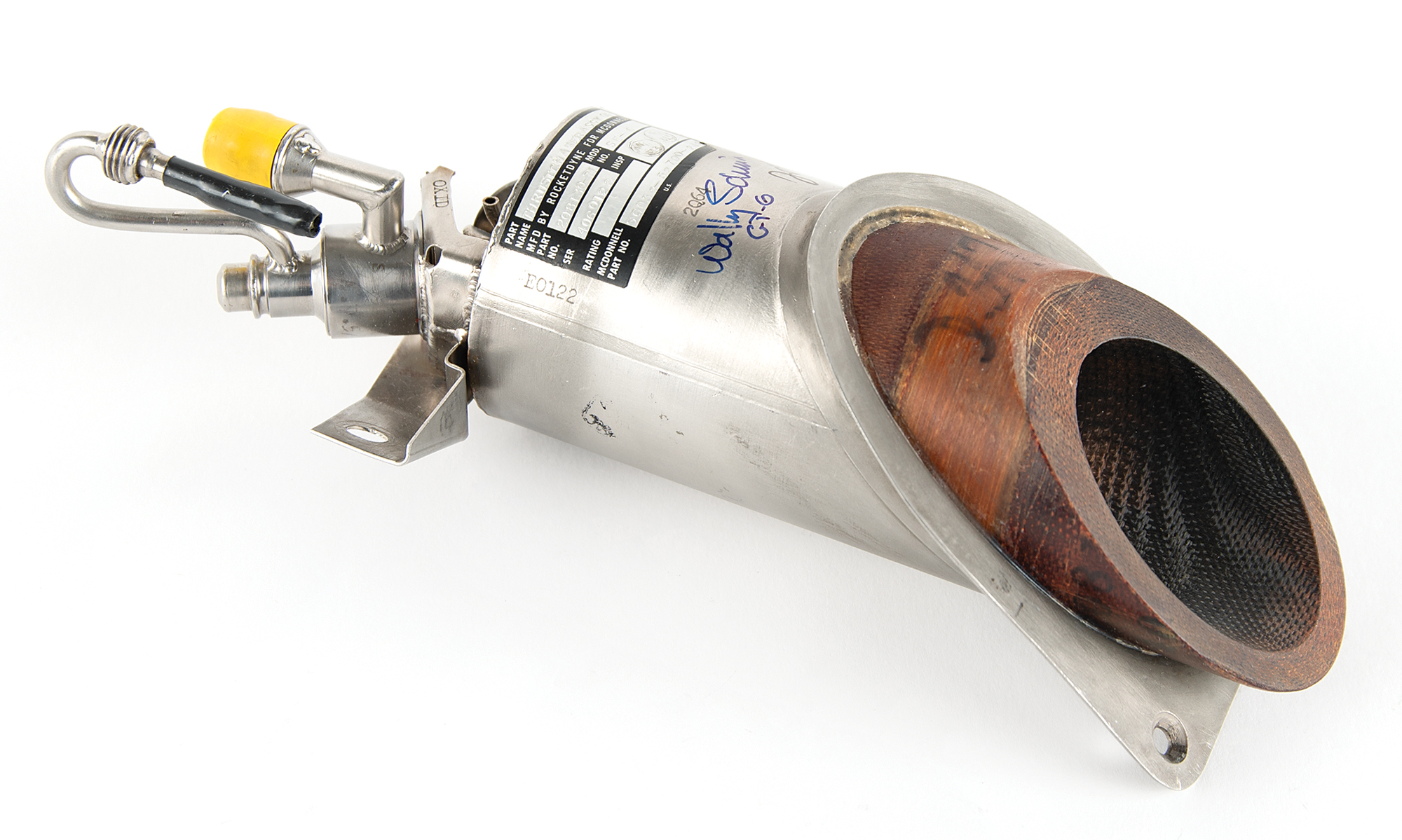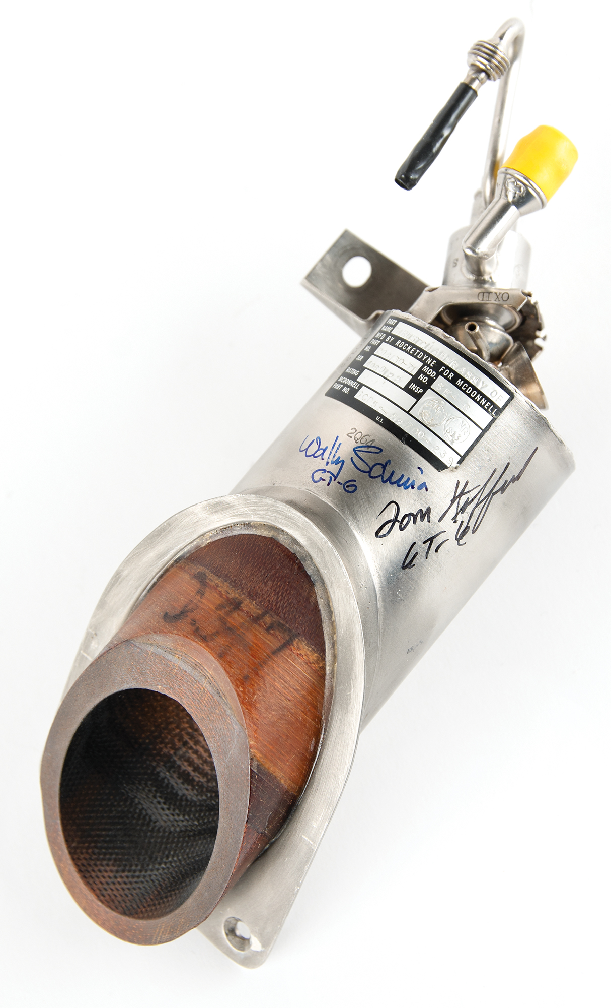 Each Gemini capsule had 16 of these thrusters positioned in the nose for maneuvering and control of spacecraft attitude during reentry. They were famously utilized during Gemini 8 as the capsule began to spin dangerously out of control: staying calm under pressure, Neil Armstrong fired the RCS thrusters to regain stability. An uncommon and desirable piece of NASA rocket hardware, signed by the crew that successfully completed the first rendezvous with another spacecraft.