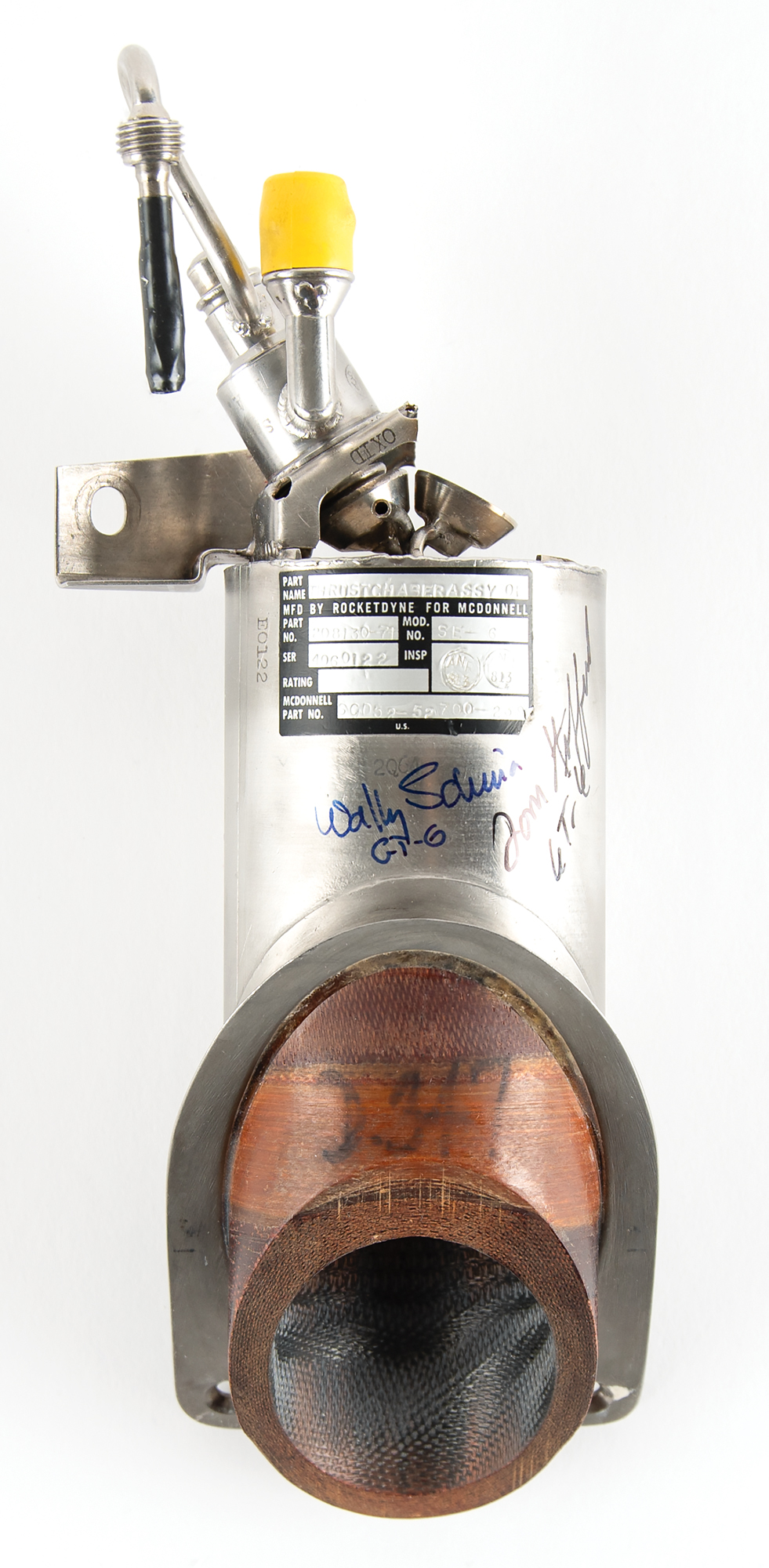 Export restricted (ITAR), sale only to US Citizens and Organizations. Rocketdyne SE-6 thruster designed for the Gemini Reentry Control System (RCS), measuring approximately 10″ x 4″ x 3″, signed on the body in blue and black felt tip by the crew of Gemini 6A, "Wally Schirra, GT-6" and "Tom Stafford, GT-6. " The manufacturer's label affixed above: "Part Name: Thrust Cha[m]ber Assy OF, Mfd. by Rocketdyne for McDonnell, Part No. 208130-71, Mod. No. SE-6, Ser. 4060122, McDonnell Part No. SCD52-52700-239." Complete with its red Rocketdyne protective cover with desiccant packet inside. In fine condition.