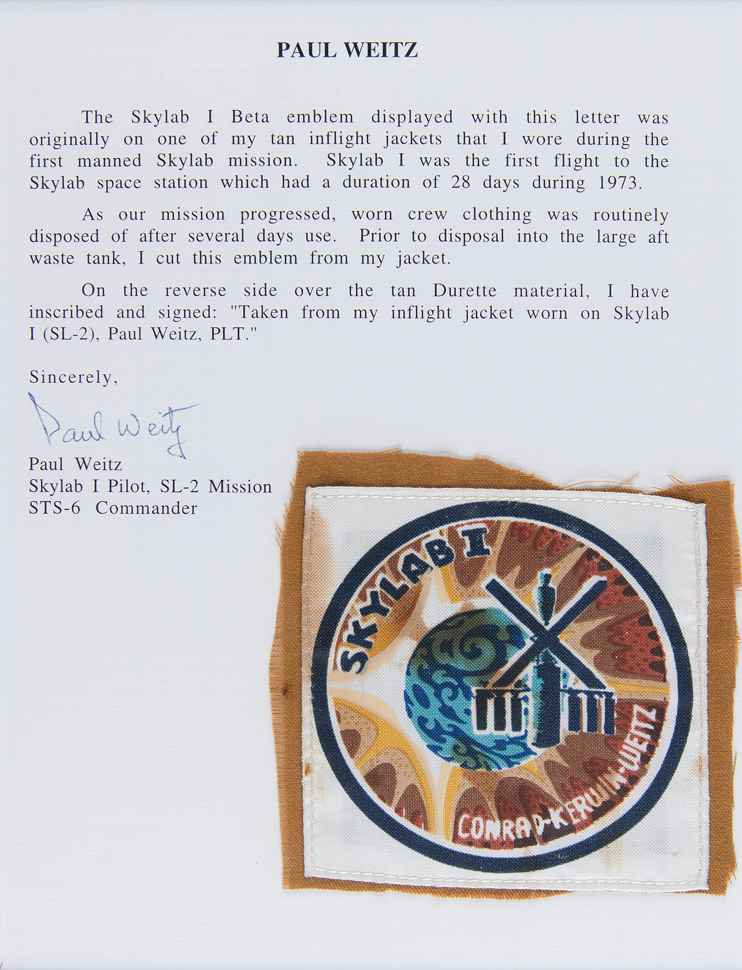 Flown Skylab 2 Beta patch cut from Pilot Paul Weitz's tan inflight jacket, measuring 3.75˝ x 3.75˝, displayed with a signed letter of provenance from Weitz, in full: "The Skylab I Beta emblem displayed with this letter was originally on one of my tan inflight jackets that I wore during the first manned Skylab mission. Skylab I was the first flight to the Skylab space station which had a duration of 28 days during 1973. As our mission progressed, worn crew clothing was routinely disposed of after several days use. Prior to disposal into the large aft waste tank, I cut this emblem from my jacket. On the reverse side over the tan Durette material, I have inscribed and signed: 'Taken from my inflight jacket worn on Skylab I (SL-2), Paul Weitz, PLT.'" Matted and framed with a portrait of Weitz wearing his tan inflight jacket to an overall size of 20.25 x 14.75. In fine condition. An appealing flown piece from America's first manned space station mission, which established a record for human spaceflight duration.