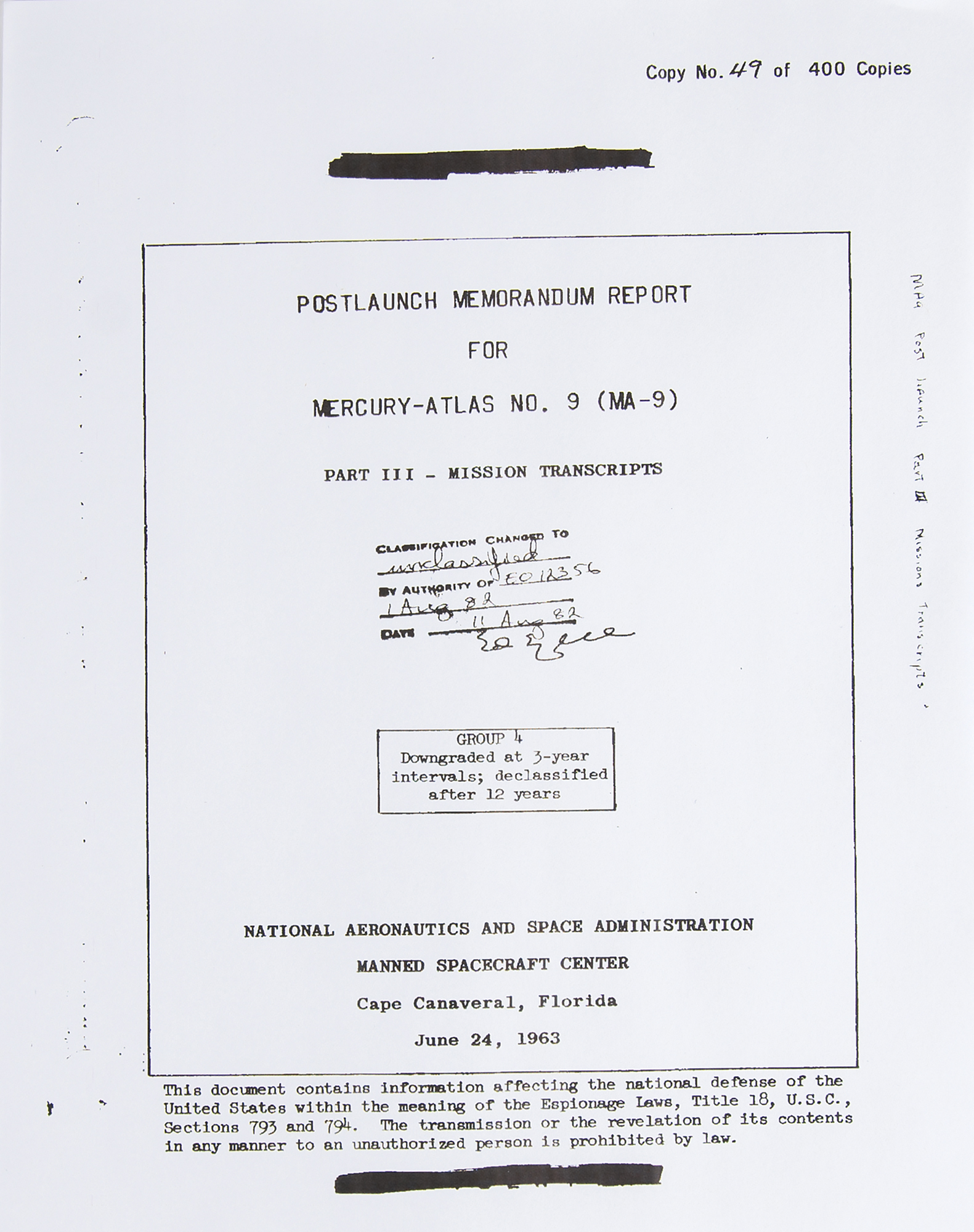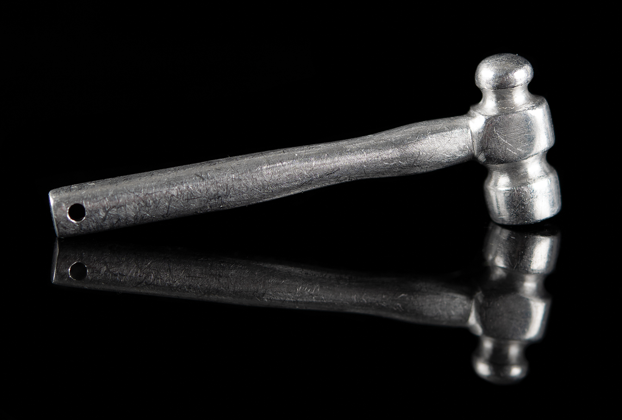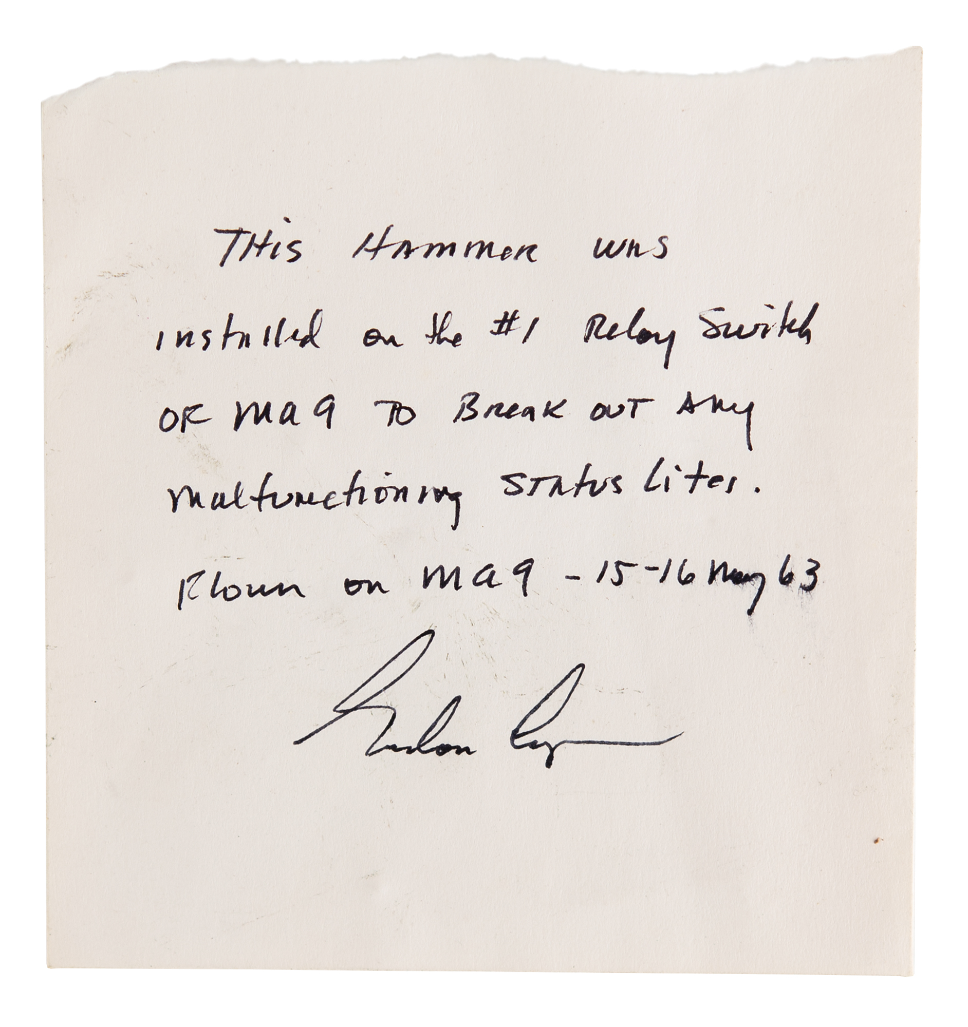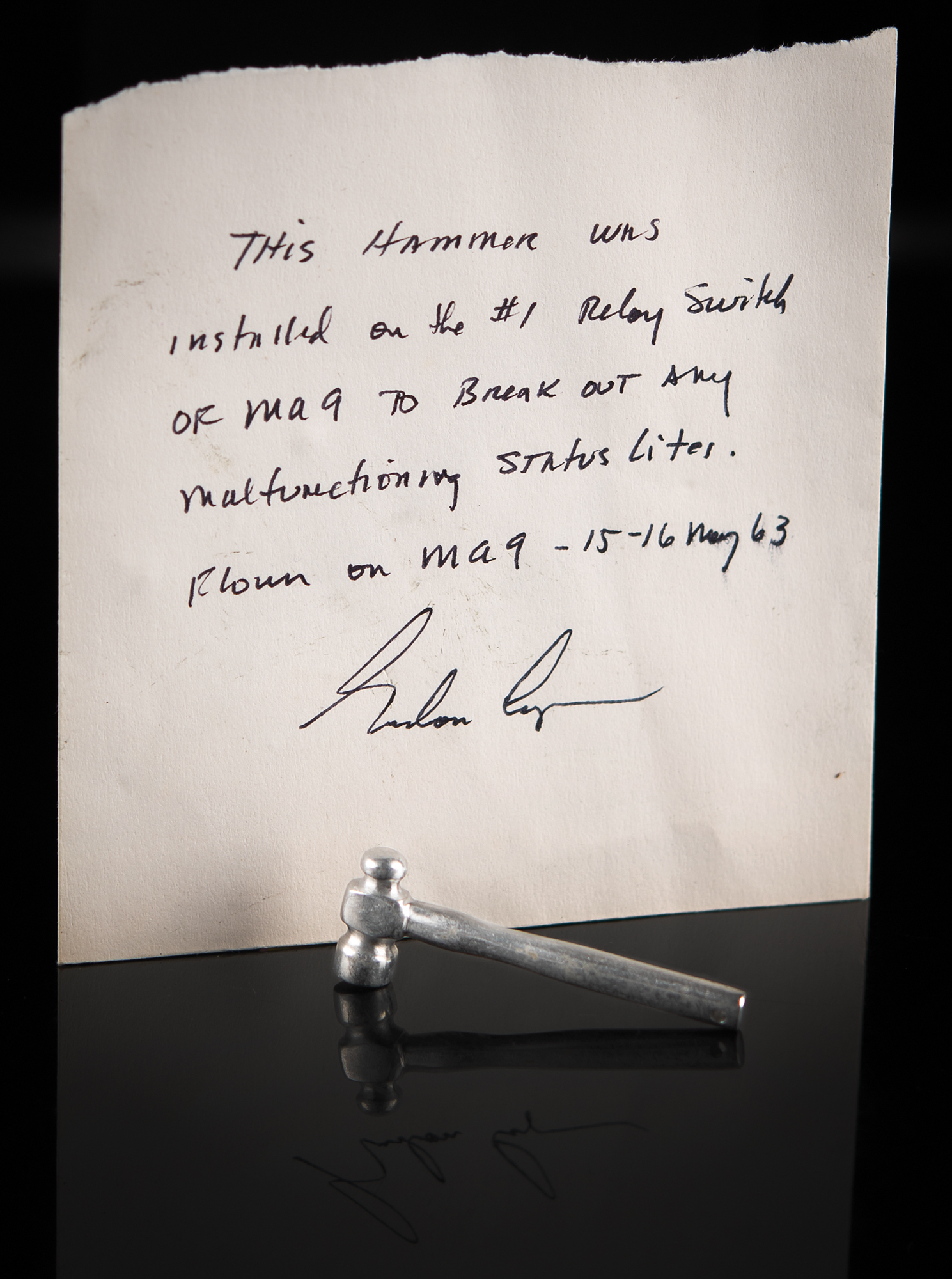 Flown miniature aluminum hammer carried on the Mercury-Atlas 9 by Gordon Cooper, measuring 2˝ long and weighing a mere 3 grams, intended to be used to break any malfunctioning status lights aboard the Faith 7 spacecraft. In fine condition. Accompanied by a handwritten and signed provenance note from Gordon Cooper, in full: "This hammer was installed on the #1 Relay Switch of MA9 to break out any malfunctioning status lites. Flown on MA9—15–16 May 63."