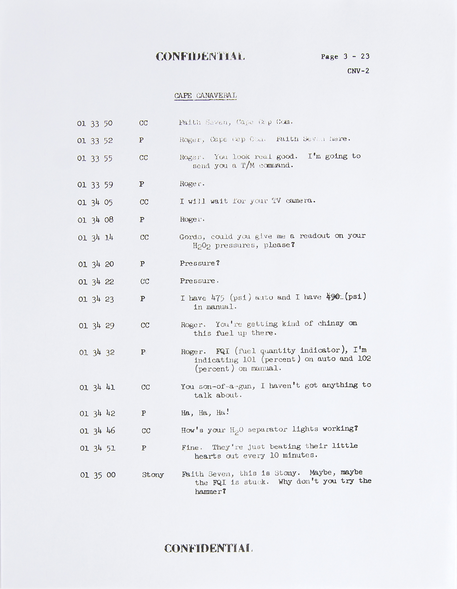 Given the diminutive mass of the tiny hammer, it was presumably carried on the mission as a gag—shattering indicator lights while on orbit had the potential to generate fragments which could get dispersed anywhere in the weightless cabin and cause malfunction. Interestingly, the 'hammer' is referenced in the Mercury-Atlas 9 mission transcript, as Cooper attempts to get correct readouts for fuel quantity. Cooper reports: 'FQI (fuel quantity indicator), I'm indicating 101 (percent) on auto and 102 (percent) on manual.' A range station communicator asks: 'How's your H20 separator lights working?' Cooper replies: 'Fine. They're just beating their little hearts out every ten minutes.' The Launch Complex 14 blockhouse communicator pipes in: 'Faith Seven, this is Stony. Maybe, maybe the FQI is stuck. Why don't you try the hammer?' Cooper says: 'Ha, ha! I'll save that for later. I'm thinking of using the hammer on the dome temp, however. On the dome temp light.' An interesting piece of history from the final flight of Project Mercury.