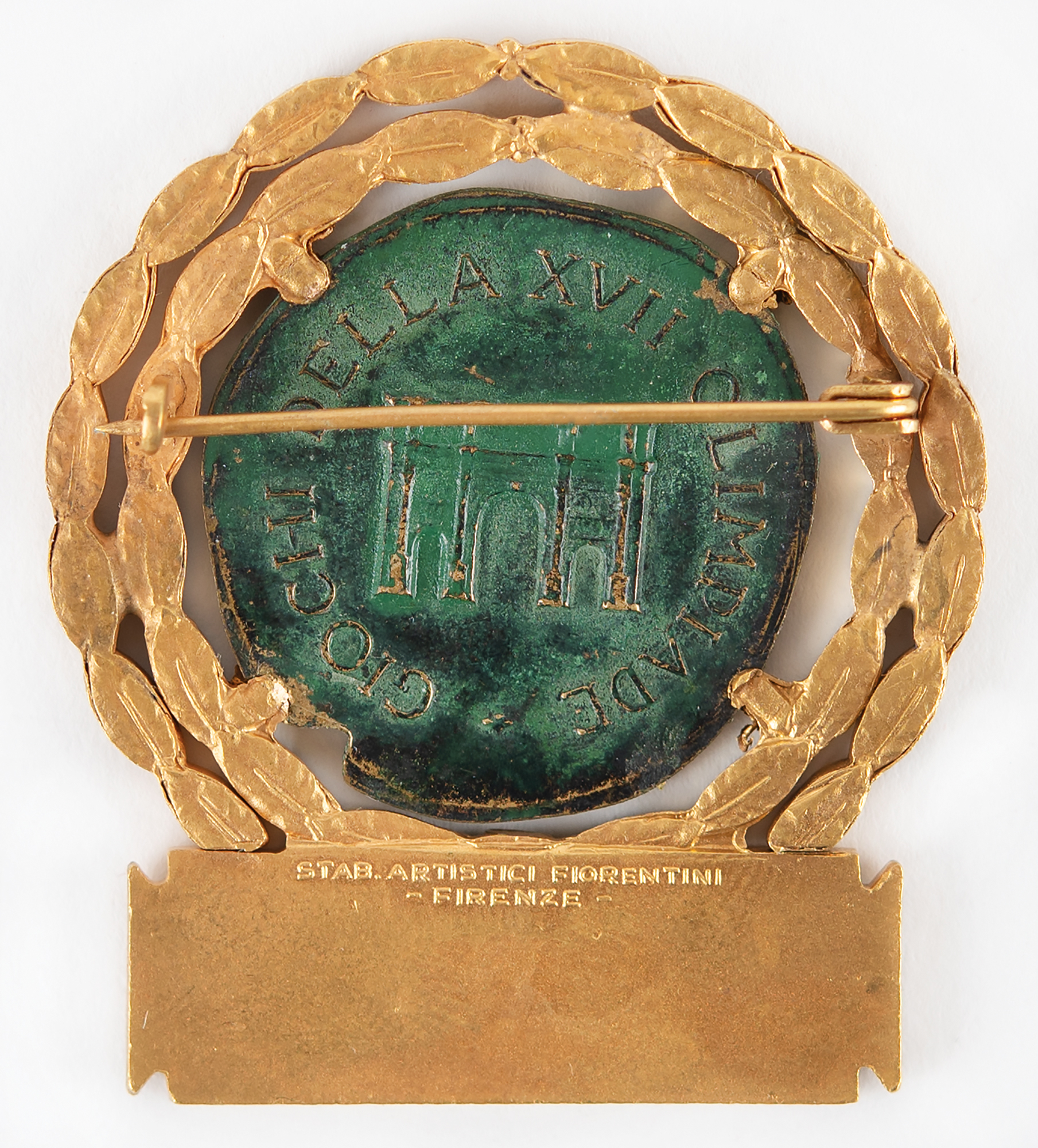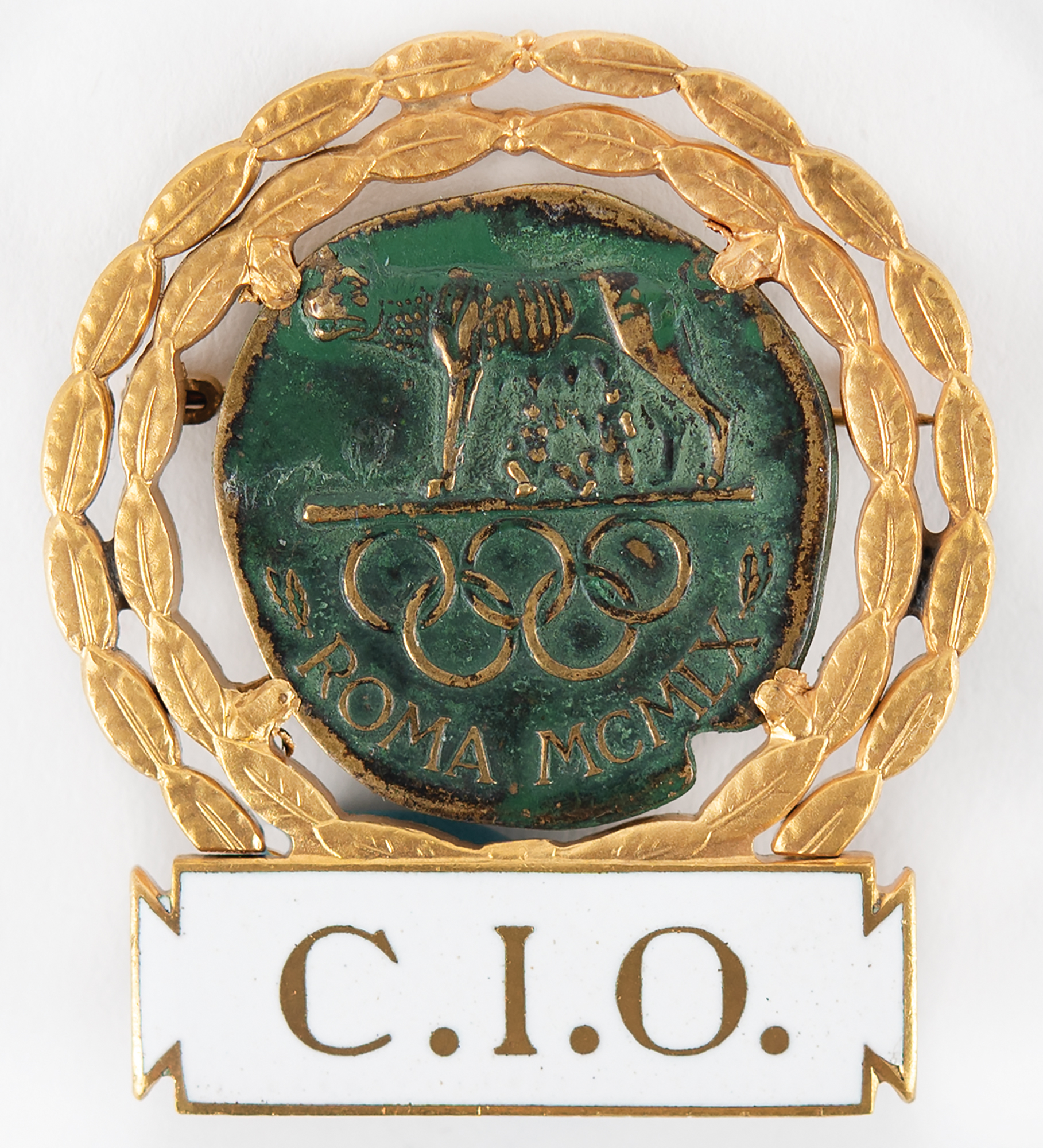 International Olympic Committee badge issued for the Rome 1960 Summer Olympics. Minted by Stabilimenti Artistici Fiorentini, 30 gm, 38 mm x 48 mm, featuring a bronze-colored bezel with an inset medallion depicting Romulus and Remus with the Capitoline Wolf, and Olympic rings below. The white enameled panel at the bottom is lettered in gold, "C.I.O." Reverse of panel stamped, "Stab. Artistici Fiorentini, Firenze." There were 78 of these badges issued at the 1960 Summer Olympics, a remarkably low number given that over 12,000 badges of 66 different types were distributed.