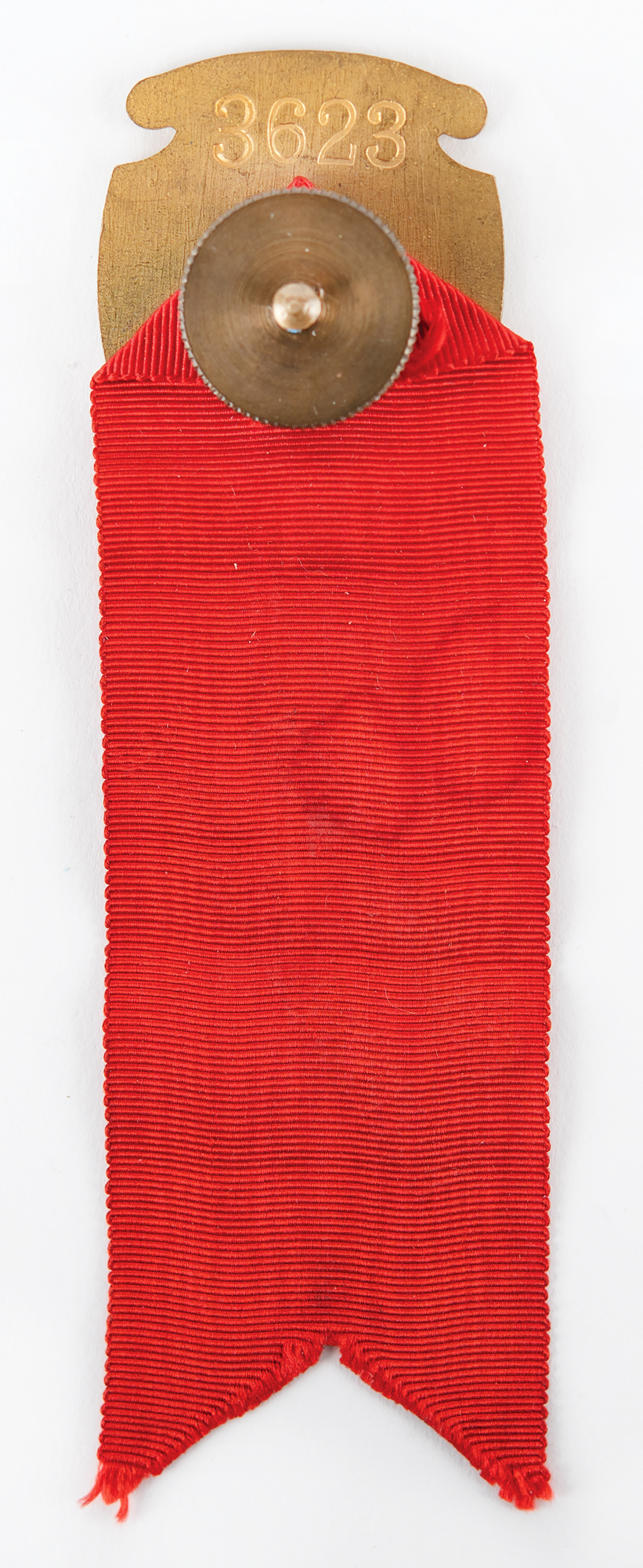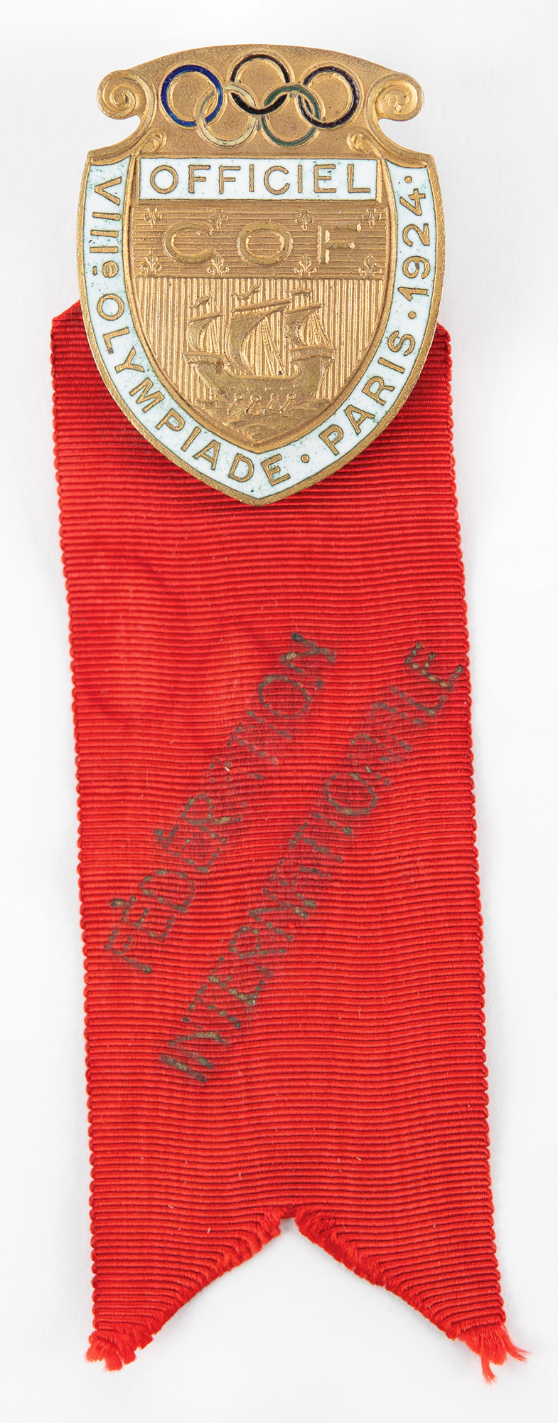 Rare ‘International Sports Federations’ official’s badge issued for the Paris 1924 Summer Olympics, 33 mm x 42 mm, featuring the Olympic rings and Paris emblem surrounded by text in white and gold: “Officiel, VIIIe Olympiade, Paris, 1924.” Above the emblem is “C. O. F. [Comite Olympic Franciase]” and the reverse is stamped “3623.” Complete with its original screw-back closure and original red ribbon, which measures 108 mm in length and is marked “Federation Internationale.”