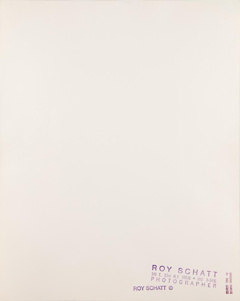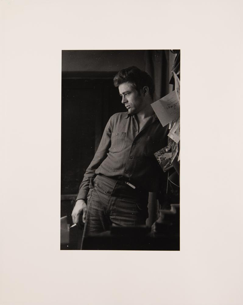 Original semi-glossy 11 x 14 silver gelatin photographic print of James Dean by photographer Roy Schatt, which depicts the actor holding a cigarette and leaning against a wall in Schatt’s studio at 149 East 33rd Street in New York City in 1954. The reverse bears Schatt’s photography credit and copyright stamps. In fine condition, with a few small surface creases in the borders.