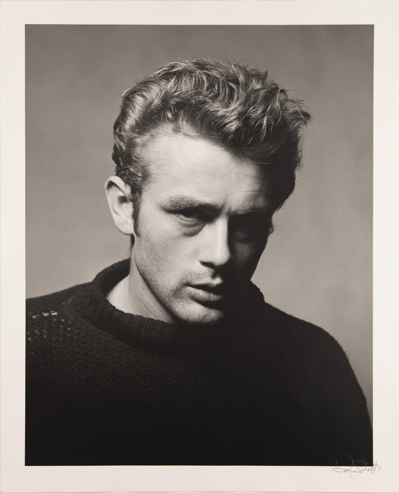 Original matte-finish 16 x 20 silver gelatin photographic print of James Dean from the 'Torn Sweater Series' taken by photographer Roy Schatt for Life Magazine on December 29, 1954, signed in the lower border in pencil by Schatt. In very fine condition.