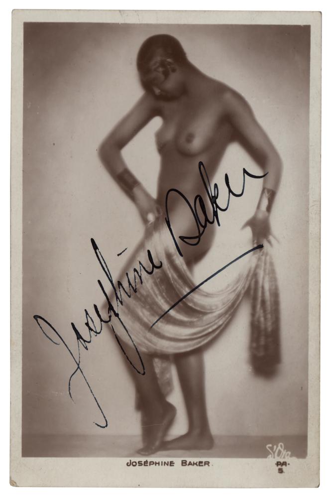 Vintage matte-finish 3.5 x 5.5 postcard photo of Josephine Baker in a beautiful semi-nude pose, signed prominently in dark black ink. In very fine condition.