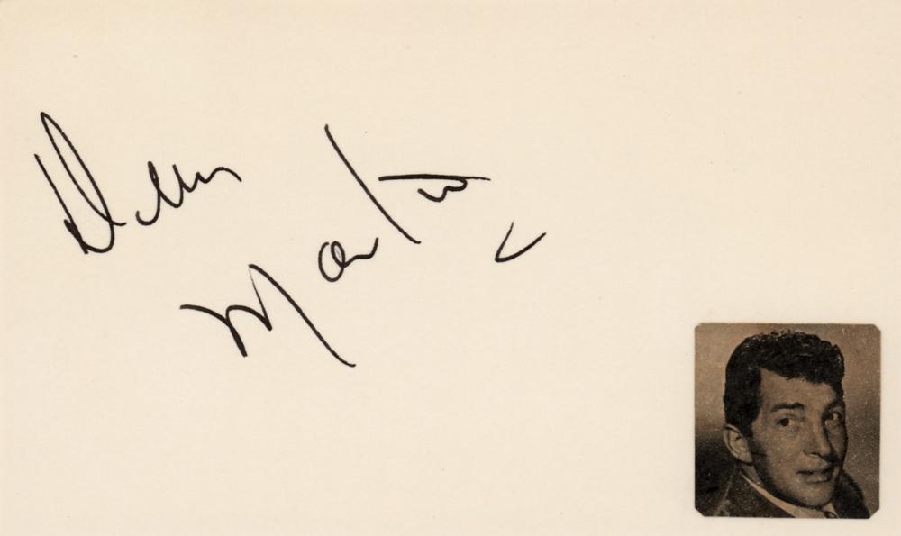 Vintage ink signature, "Dean Martin,” on an off-white 5 x 3 card with an affixed portrait. In very fine condition.