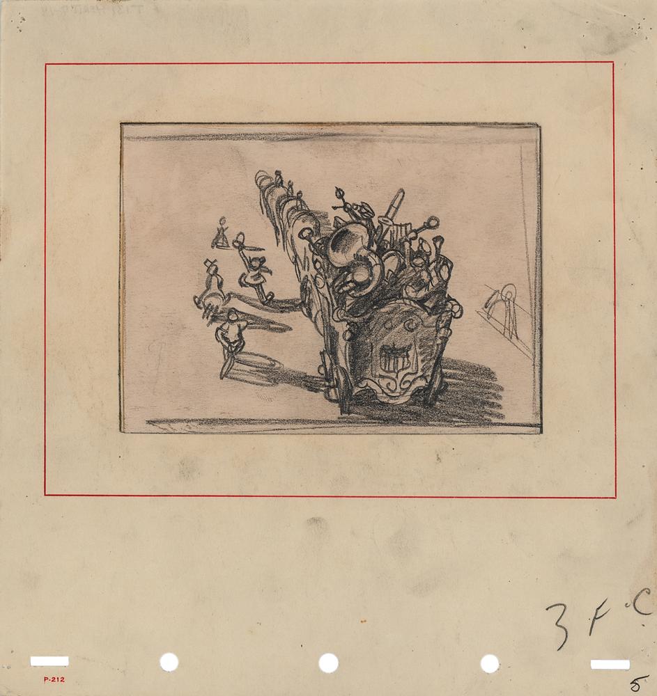 (Walt Disney Studios, 1941) Original concept storyboard drawing of a Circus Band from Dumbo, which shows the band playing in the back wagon of an elephant-drawn circus train, with children seen running along the side. Accomplished in graphite on 5.25 x 3.75 artist paper, which has been affixed to an 8.25 x 8.75 sheet of animation paper marked "3FC, 5" in the lower right corner. Image measures 4.25 x 3.25. In fine condition, with pin holes to corners and a bend to the upper left corner of the animation paper.