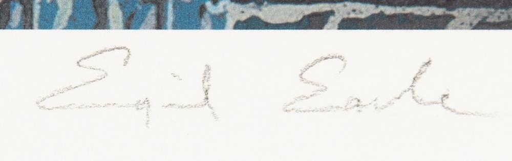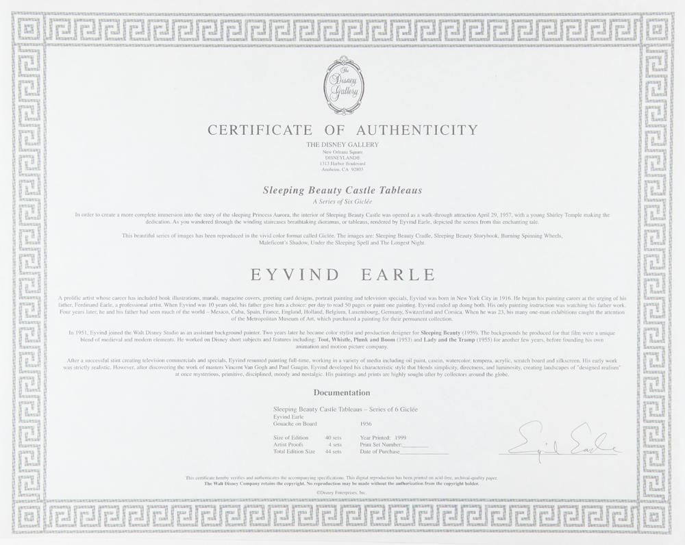 Sought-after limited edition color 20 x 16 giclee print from The Disney Gallery’s ‘Sleeping Beauty Castle Tableaus,’ a series of six giclee prints featuring the artwork of the great Eyvind Earle, who has signed in the lower border in pencil. This particular print, entitled ‘Burning Spinning Wheels,’ is numbered 2/40 and depicts King Stefan and Queen Leah watching the pyre of spinning wheels burning brightly in their castle courtyard. In very fine condition. Accompanied by the original certificate of authenticity from The Disney Gallery, which bears Earle’s facsimile signature.