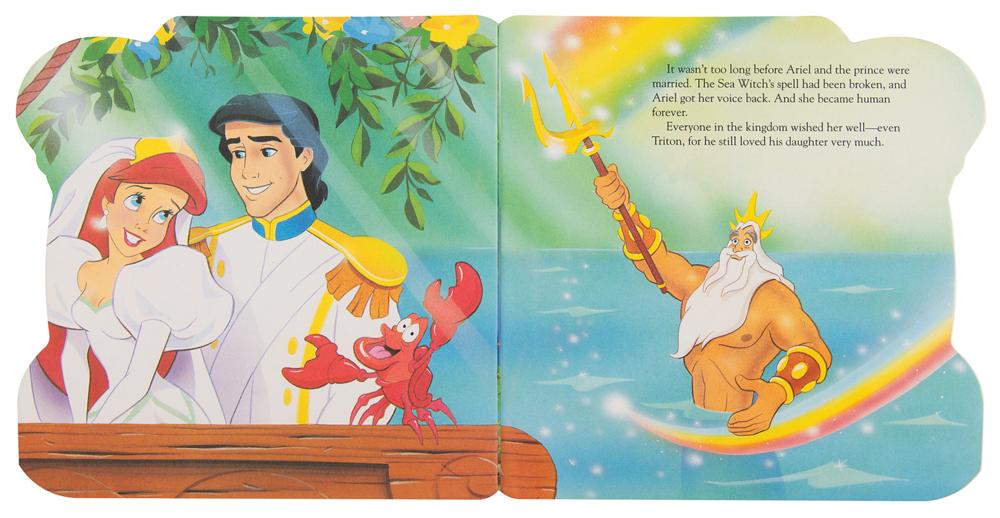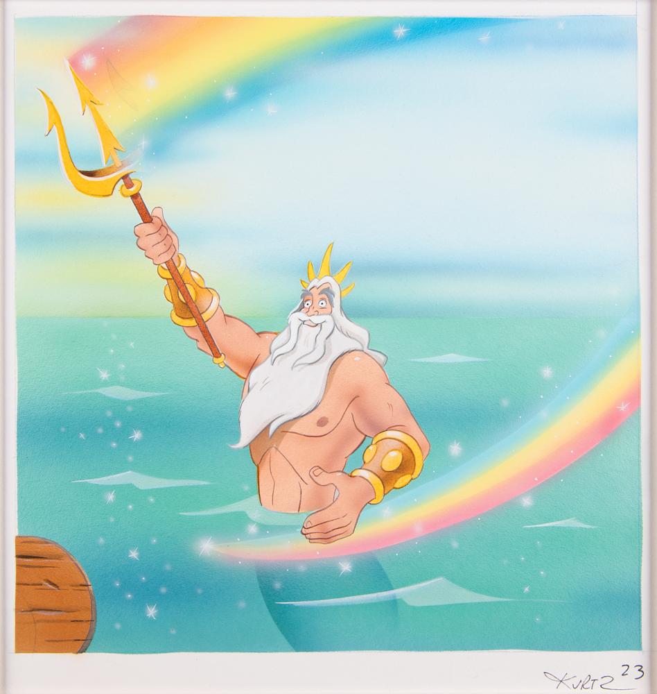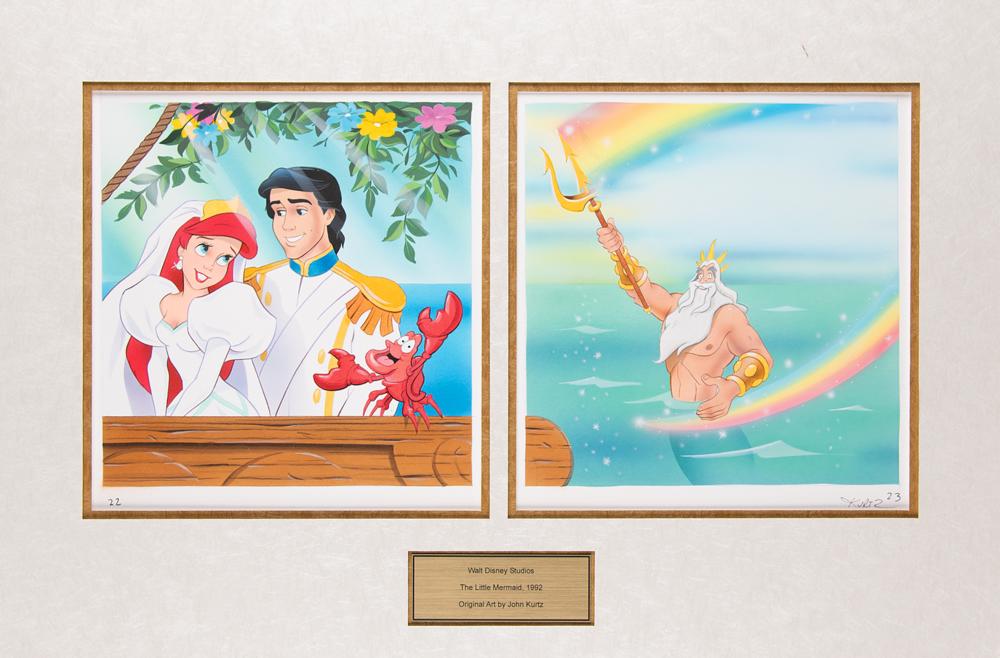 (Walt Disney Studios, 1992) Beautiful original book artwork by acclaimed illustrator John Kurtz for the book The Little Mermaid: Sebastian's Story, published by A Golden Book in 1992, containing two gorgeous original works used for the wedding at the close of the story: Ariel, Prince Eric, and Sebastian are pictured together on a ship, and King Triton is shown waving his rainbow trident from the sea. Both scenes are accomplished in gouache, ink, and graphite, measure 8.25 x 8.5, and are numbered “22” and “23,” respectively, with the lower border of the Triton artwork signed in black ink by the artist, “Kurtz.” Both pieces are double-matted together with a small plaque to an overall size of 22.25 x 14.75. In very fine condition. Accompanied by a first edition of The Little Mermaid: Sebastian's Story, which contains both works in finished form at the end of the book.