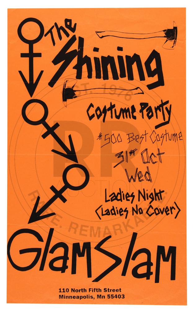 Rare original orange 8.5 x 13 poster for “The Shining Costume Party” held at Prince’s Glam Slam nightclub in Minneapolis, Minnesota, on Halloween, October 31, 1990, listing a $500 prize for best costume, and featuring three ‘love symbols,’ a pair of axes with the text “The Shining,” and the club’s address to the lower portion. In fine condition, with intersecting folds and a couple of staple holes.