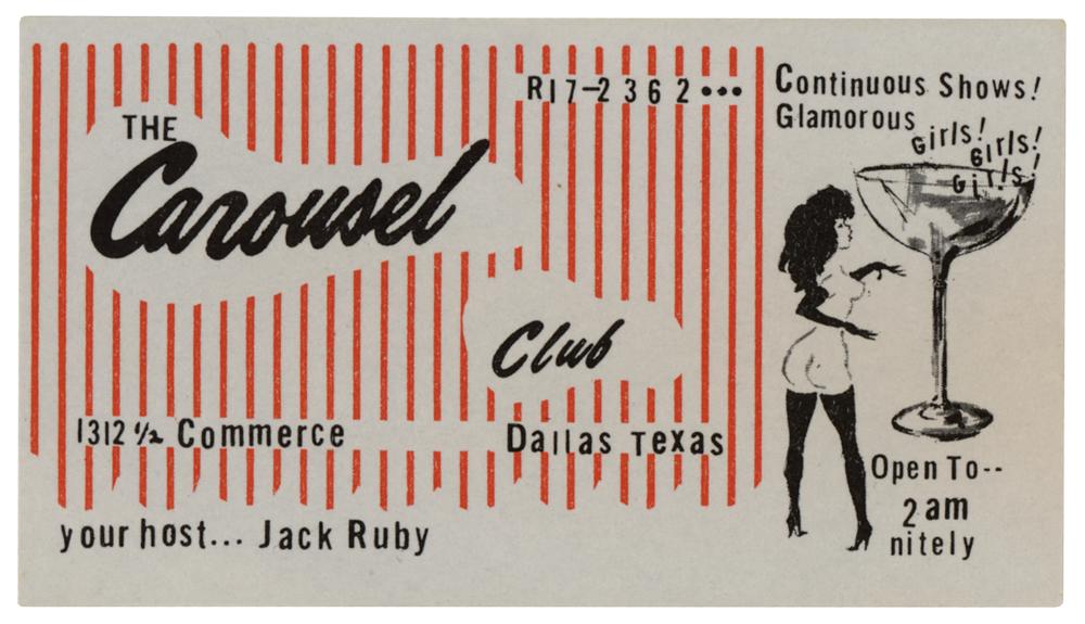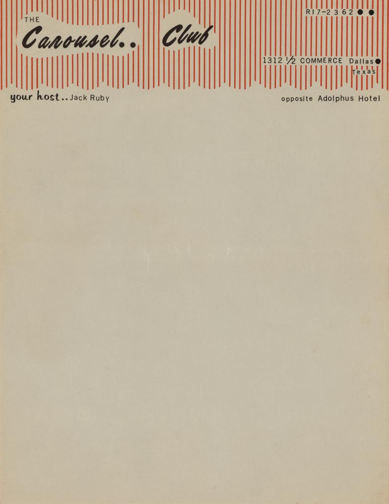 Rare original business card and stationery sheet from The Carousel Club, a nightclub owned by Jack Ruby in Dallas, Texas. Both the card, 3.75 x 2.25, and the stationery sheet, 8.5 x 11, have a similar design with phone number and address, and both list “your host...Jack Ruby.” The card features a nude dancing girl next to a cocktail glass and reads: “Continuous Shows! Glamorous Girls! Girls! Girls! Open To 2 AM Nitely.” In overall fine condition.