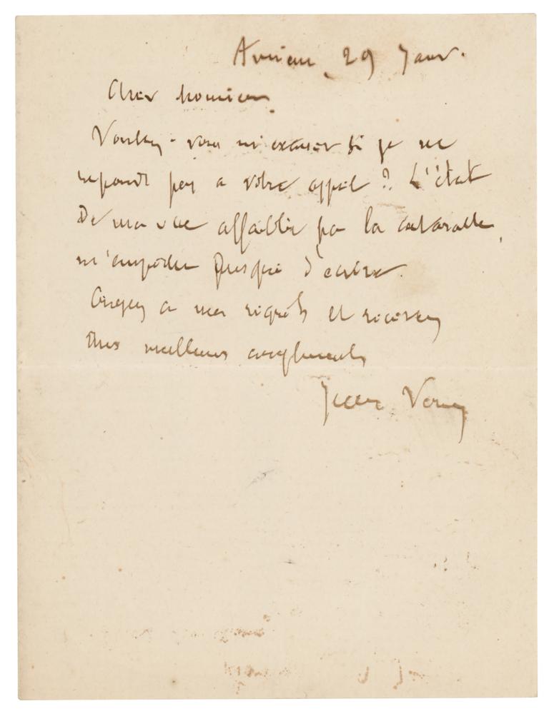 ALS in French, signed "Jules Verne," one page, 4 x 5.25, January 29, [no year]. Untranslated handwritten letter by the pioneering science fiction author. In fine condition.