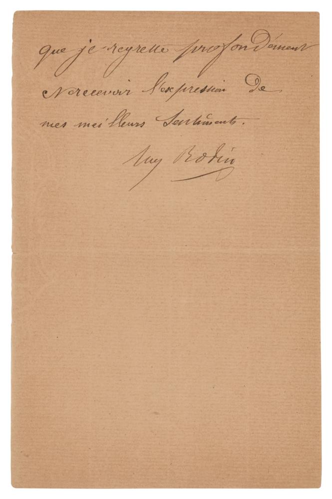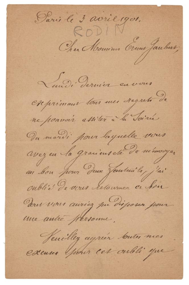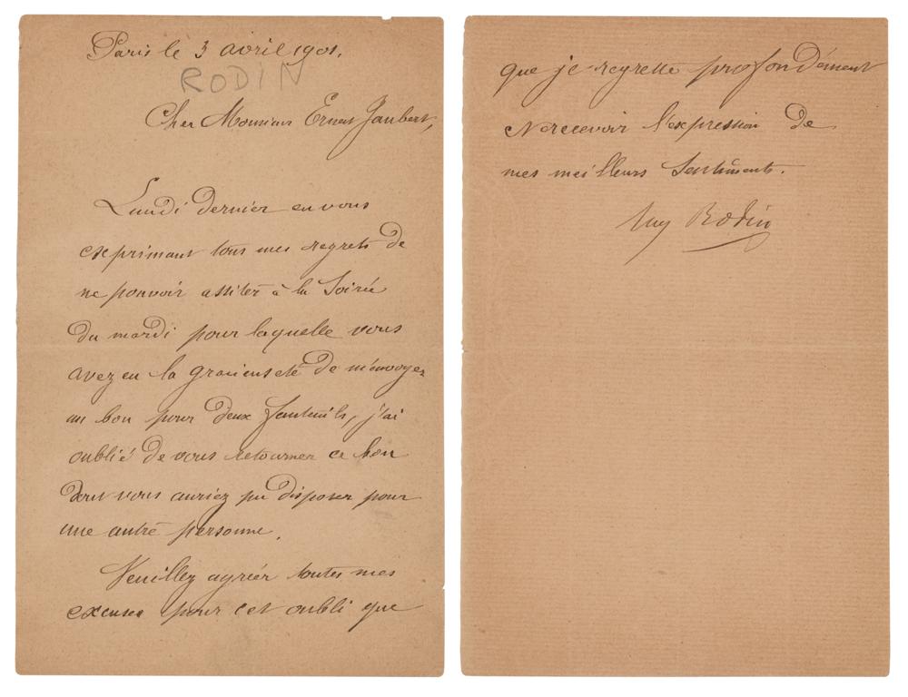 LS in French, signed “Aug. Rodin,” two pages, 4.5 x 7, April 3, 1901. Addressed from Paris, an untranslated letter from Auguste Rodin to the French writer Ernest Gaubert. In fine condition.
