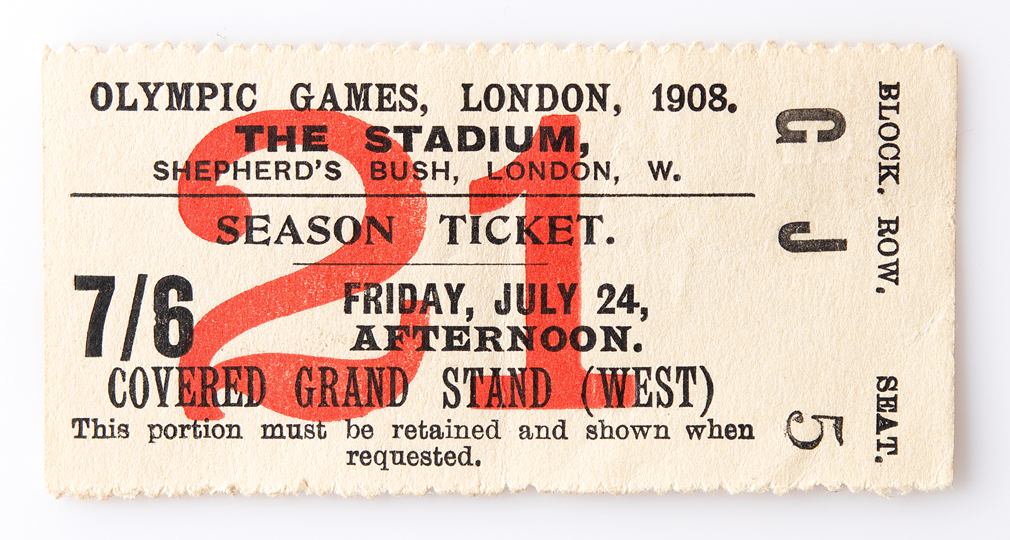 Original season ticket for the London 1908 Olympic Games, 3 x 1.5, printed for entrance into “The Stadium” in Shepherd's Bush on July 24th (afternoon), issued for Block G, Row J, and Seat 5 in the “Covered Grand Stand (West).” In fine condition.