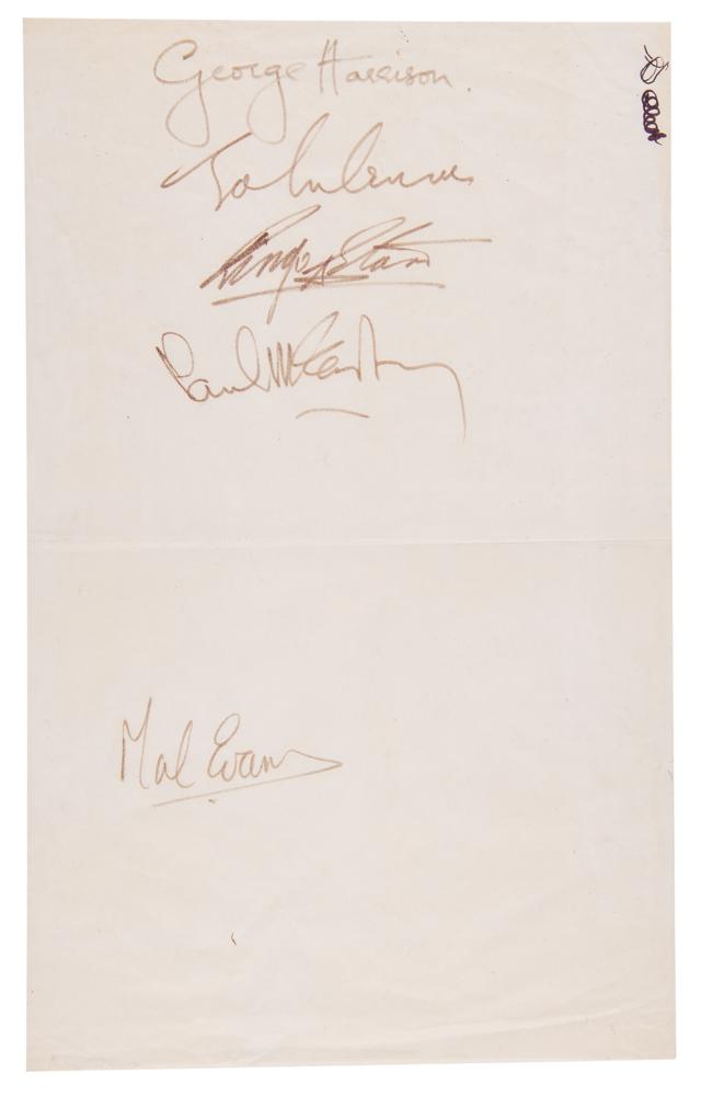 Felt tip signatures of the Beatles, "George Harrison," "John Lennon," "Ringo Starr," and "Paul McCartney,” on an off-white 8 x 13 sheet, the lower portion of which is also signed by the band's longtime road manager and personal assistant, Mal Evans, from whose collection these signatures derive. In fine condition, with slight overall creasing.