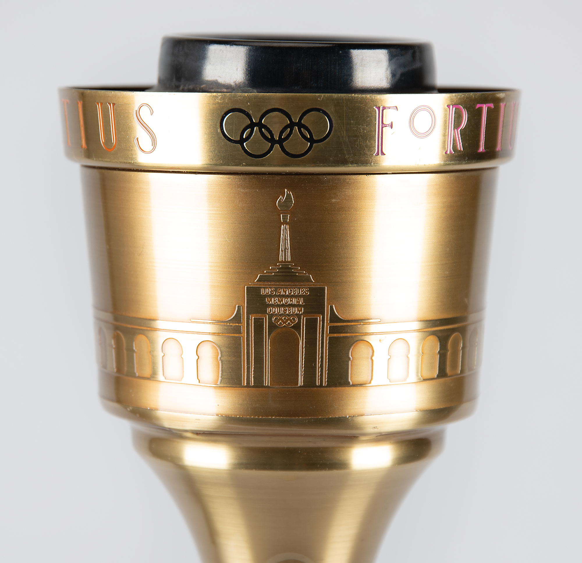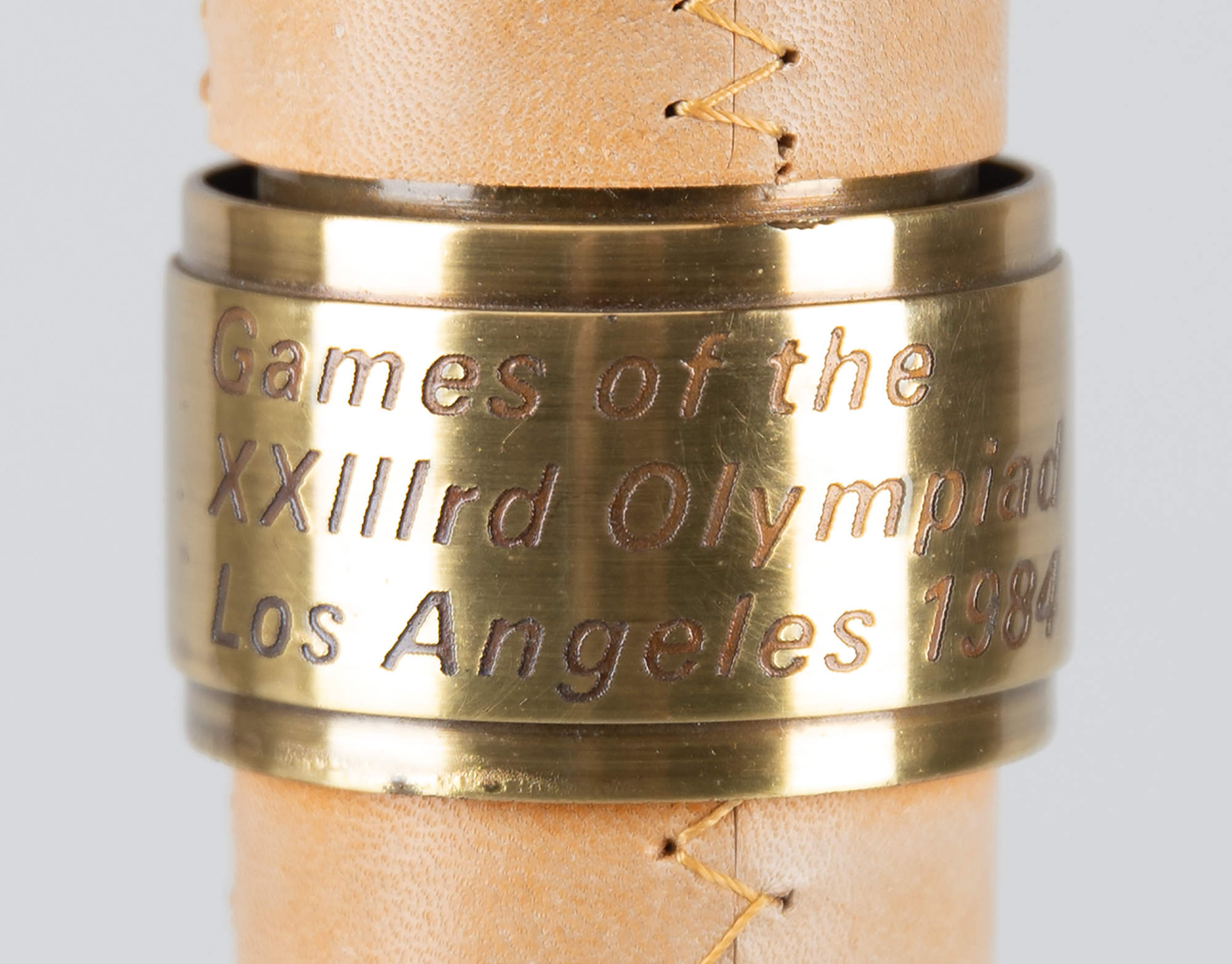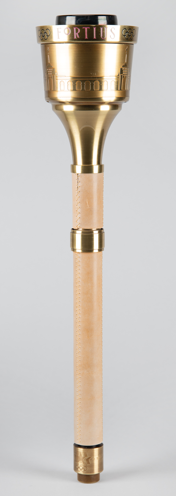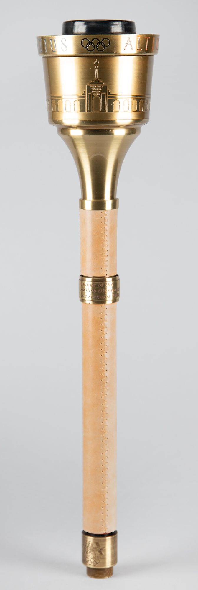 Choice unused official 1984 Los Angeles Olympics torch, brass-finished with tan leather handles, measuring 22.25" in length and 4.75" at its widest point, manufactured by Turner Industries and engraved "1983 LAOOC," with a pair of Los Angeles Games logos on the base of the handle. The black burner remains in place, for an overall length of 23". Bowl is engraved along the top, "Citius, Altius, Fortius, " with the rings between each word, and the L.A. Memorial Coliseum Stadium below. Complete with its original black vinyl carrying bag.
