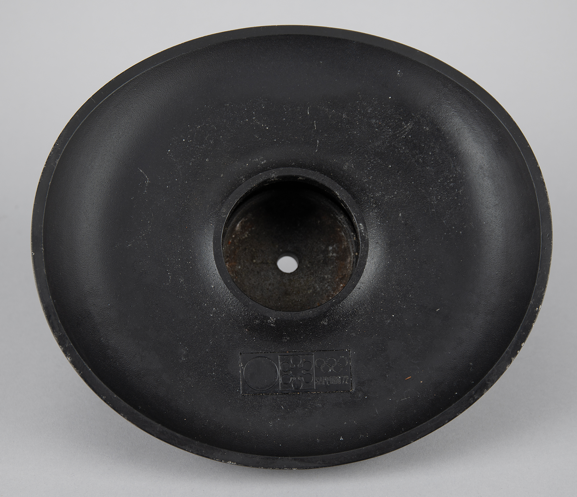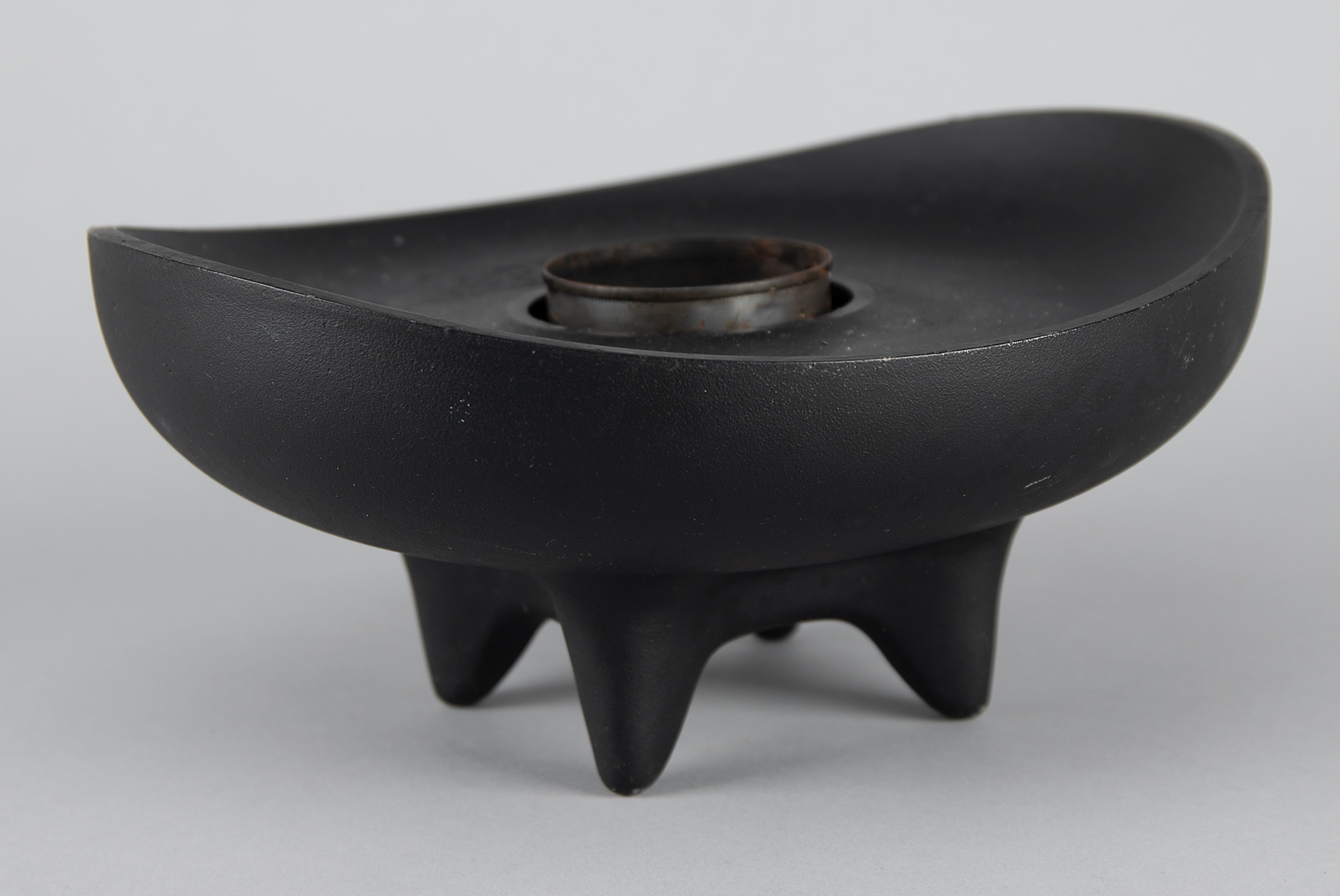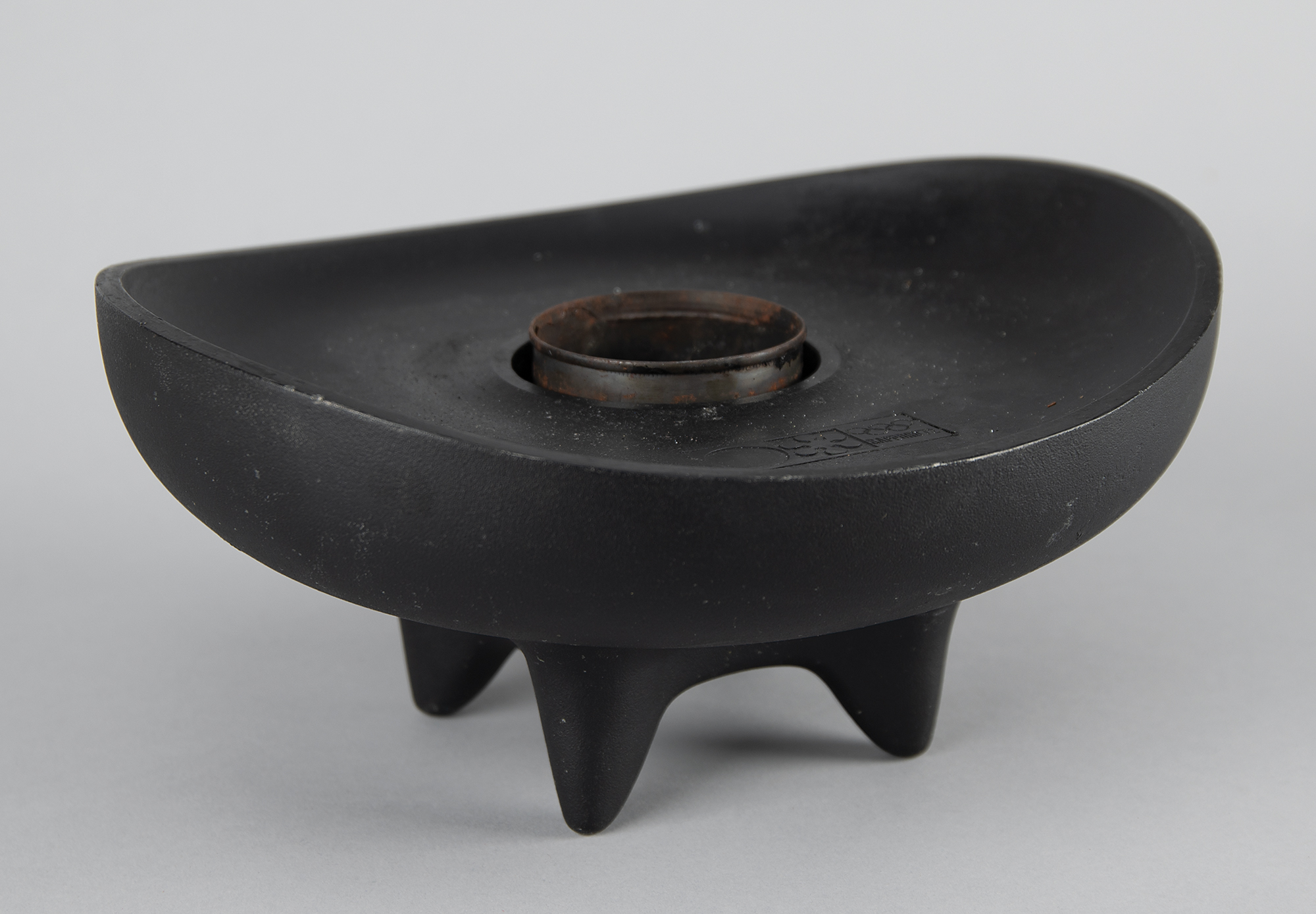 Official 1972 Sapporo Winter Olympics 'sacred vessel' cauldron, consisting of a cast-blackened aluminum alloy bowl with burner insert, measuring an overall 10.25″ x 5″ x 9.25″, impressed on the top with the Sapporo Games logo, and the bottom engraved "Nikkei" and "Yanagi." The Sapporo torch designer, Sori Yanagi, was a pioneer of Japanese industrial design, whose simplistic and pure use of lines and curves were regarded as patently Japanese as they were universal. Inspired by the shape of the Olympic cauldron, the vessel is described in the Official Report of the XIth Olympic Winter Games: 'This vessel was used as the 'intermediary' in transferring the Sacred Flame from the burner-carrier to the Olympic Torch and vice-versa during the ceremonies performed upon arrival at and departure from each overnight stopping place along the relay course.' A very scarce piece, this is the first example we have offered.