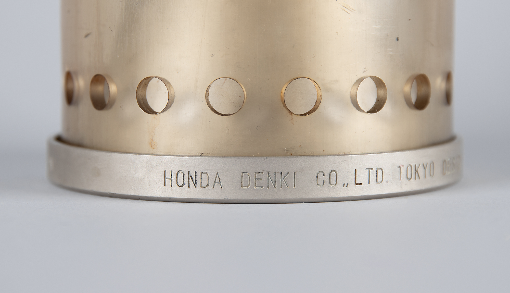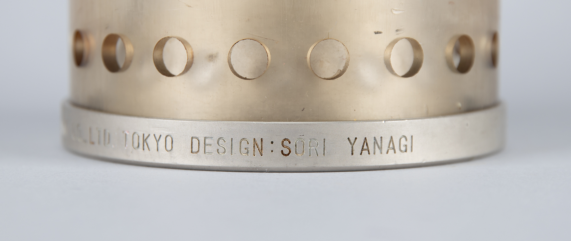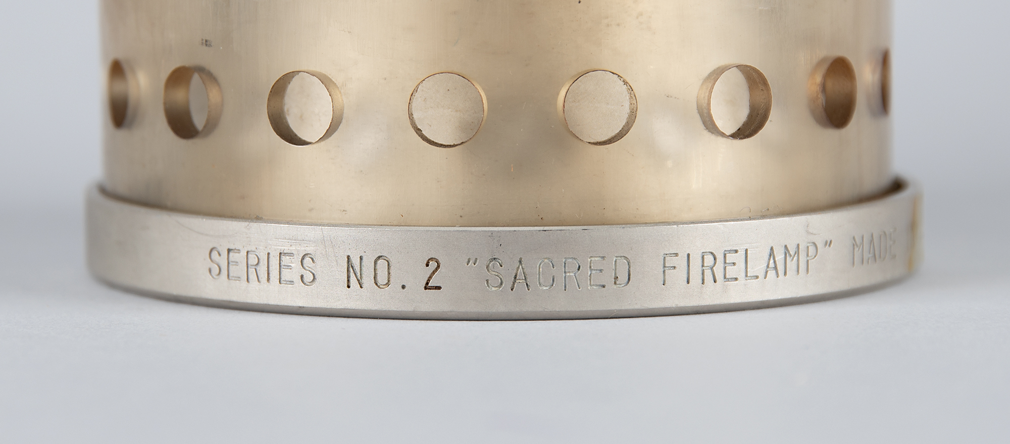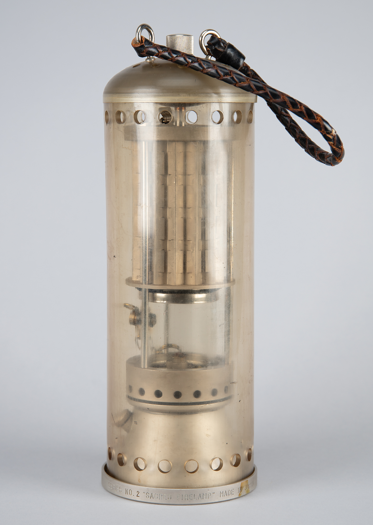 Rare 'mother flame' safety lamp from the Tokyo 1964 Summer Olympics, 13.5″ in height and 4.5″ in diameter, manufactured by the Honda Denki Co. Ltd., Tokyo, and designed by Sori Yanagi, engraved around the bottom ring: "Series No. 2, 'Sacred Firelamp,' Made in Japan." The modified miner's lamp is housed in an acrylic dome and suspended from a braided black leather handle. This design enabled the Olympic flame to be protected and safely transported by automobile and aircraft along the relay route.