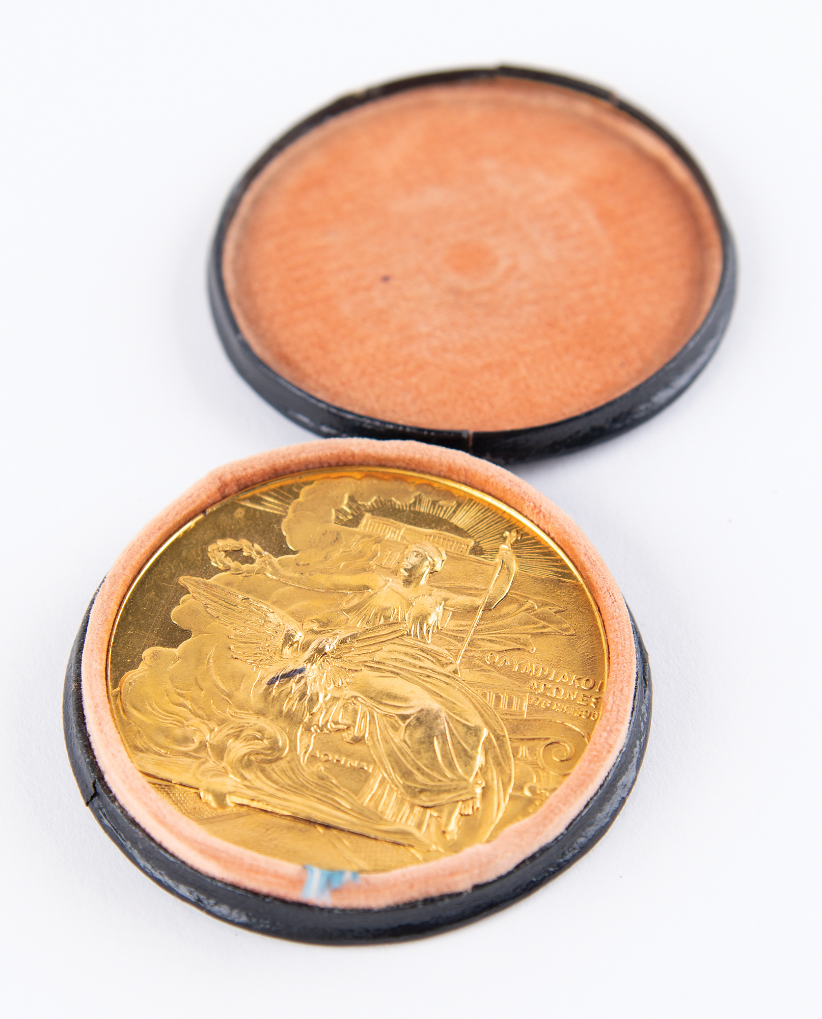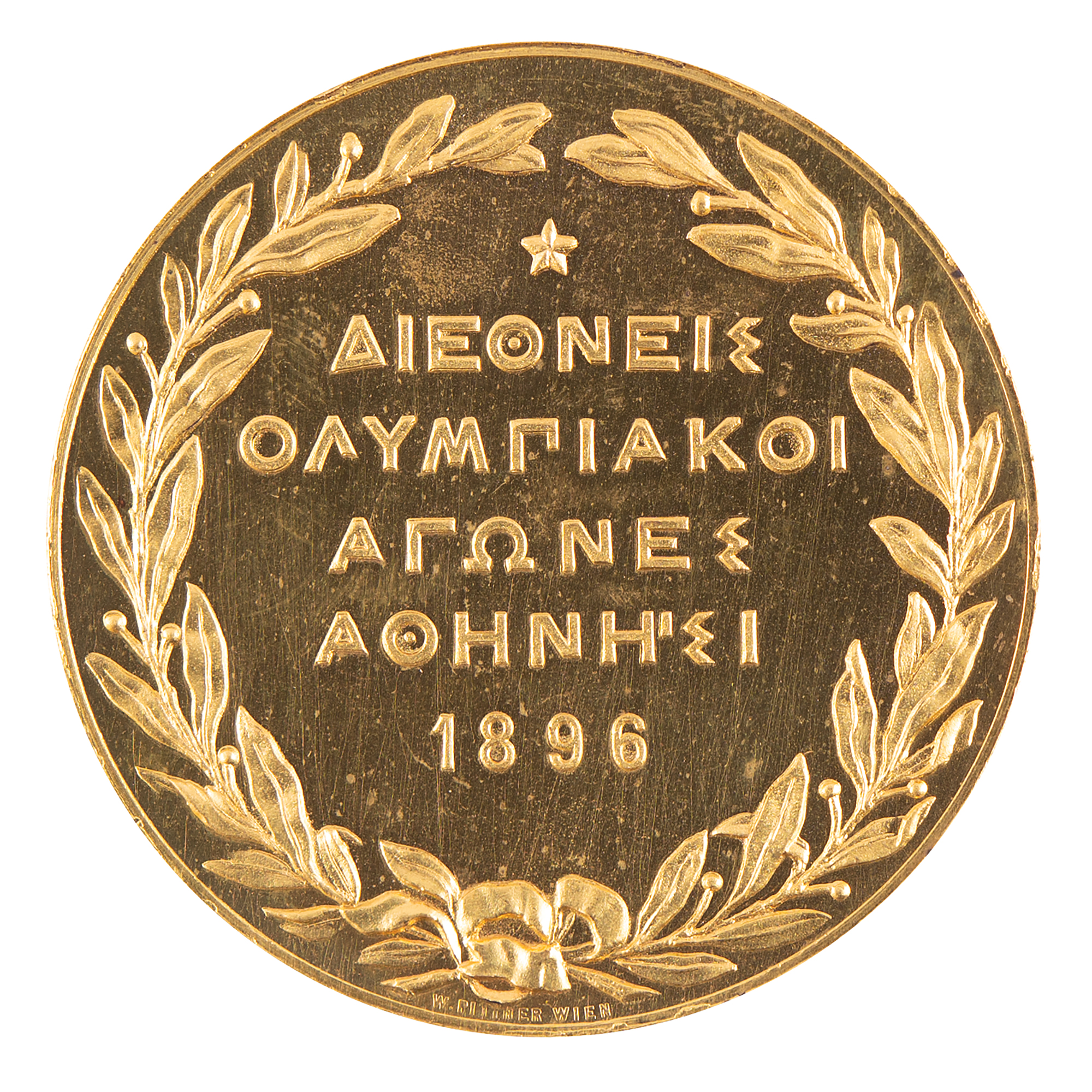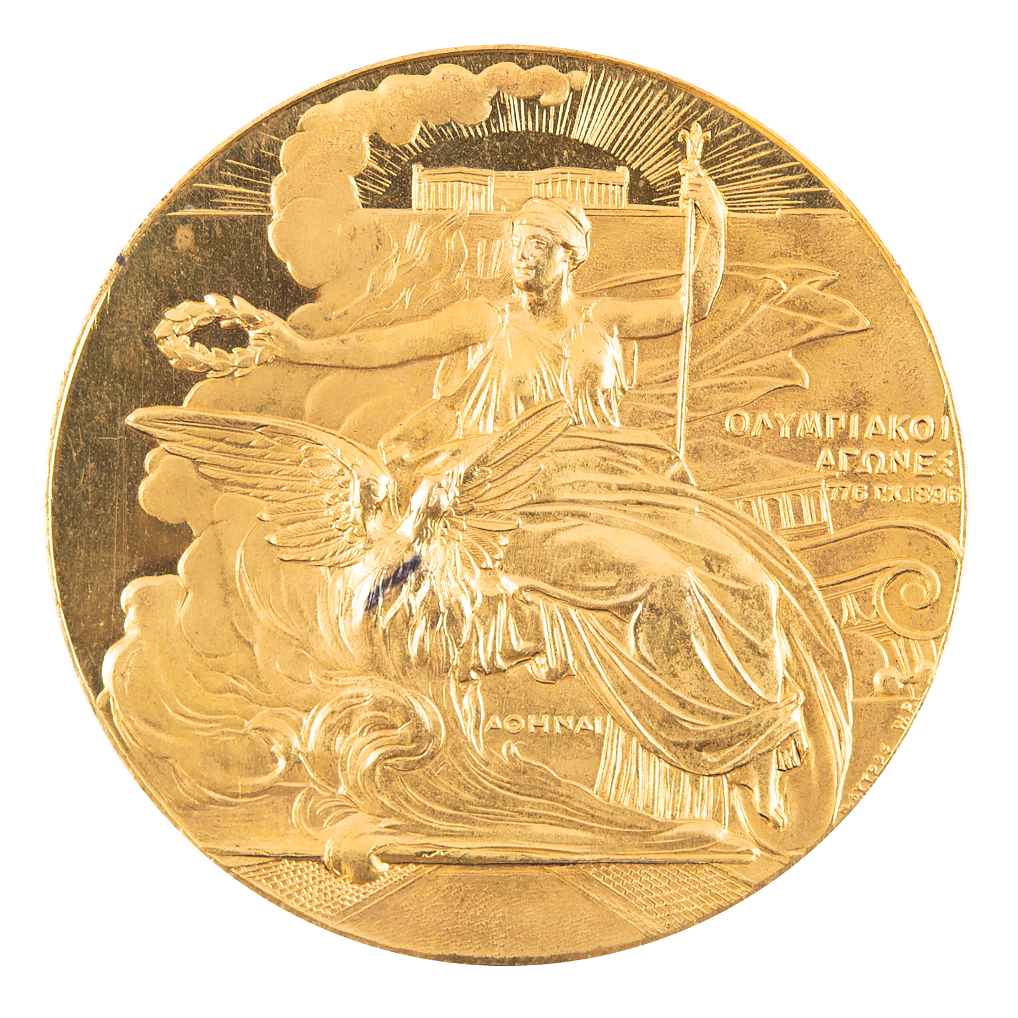 Participation medal issued for the Athens 1896 Olympics. Gilt bronze, 50 mm, 58 gm, by W. Pittner, Austria. The front features a seated Nike holding a laurel wreath over a phoenix emerging from flames, with the Acropolis in the background; the reverse bears a star surmounted above five lines of Greek legend set within a laurel wreath. The immolation of the phoenix and its emergence from the ashes symbolizes the rebirth of the Olympic Games after a hiatus of more than 1,500 years. Includes its original circular leather presentation case. An uncommon and desirable medal given the sheer historical significance of the Olympiad and how so few examples were ultimately struck.
