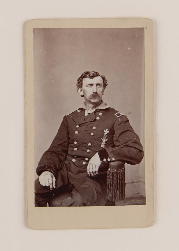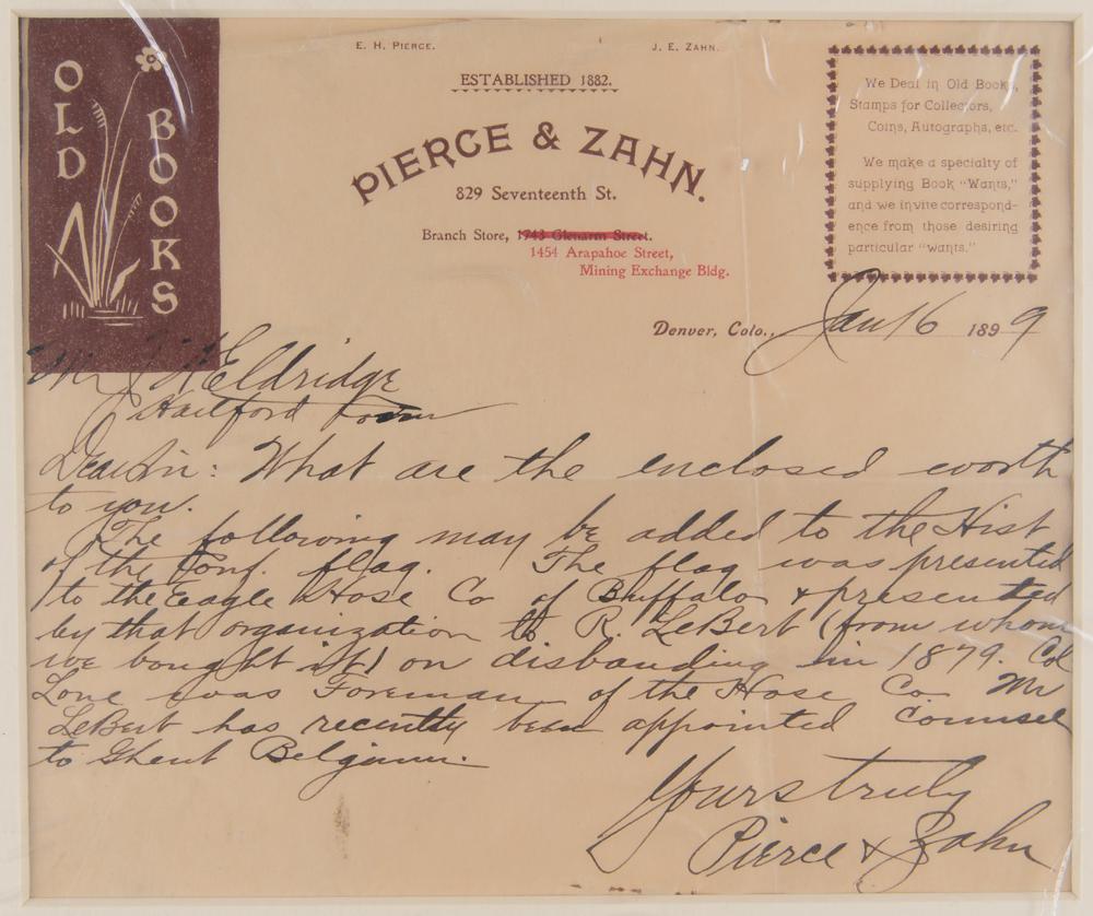 Also housed in the frame is a carte-de-visite of George Maltby Love in the double-breasted frock coat of a Brigadier General and wearing his Medal of Honor. George Maltby Love was credited with the capture of the battle flag of the 2nd South Carolina at the battle at Cedar Creek on October 19, 1864, and was subsequently awarded the Medal of Honor for his actions. Love was affiliated with the Eagle Hose Company and evidently Colonel Thomas (either on his own or at Love's request) wanted to send a piece of the famous flag to Love's friends as a memento. Attached to the rear of the frame is an 1899 letter from Pierce & Zahn of Denver, Colorado, to noted Civil War veteran and collector James W. Eldridge offering the fragment for sale and relating that the Eagle Hose Company had disbanded and presented the fragment to an "R. Le Bert" (or "Le Beuf"). This is the only known surviving fragment of the 2nd South Carolina battle flag and is a fabulous, well-documented Civil War rarity.