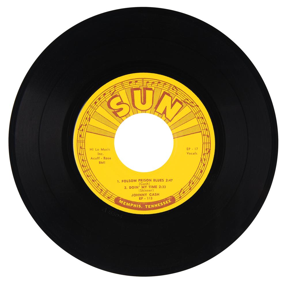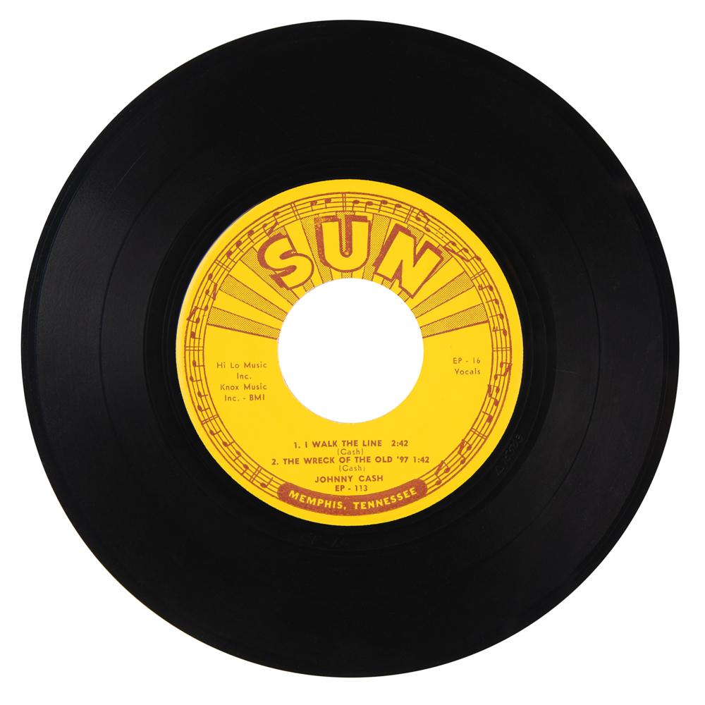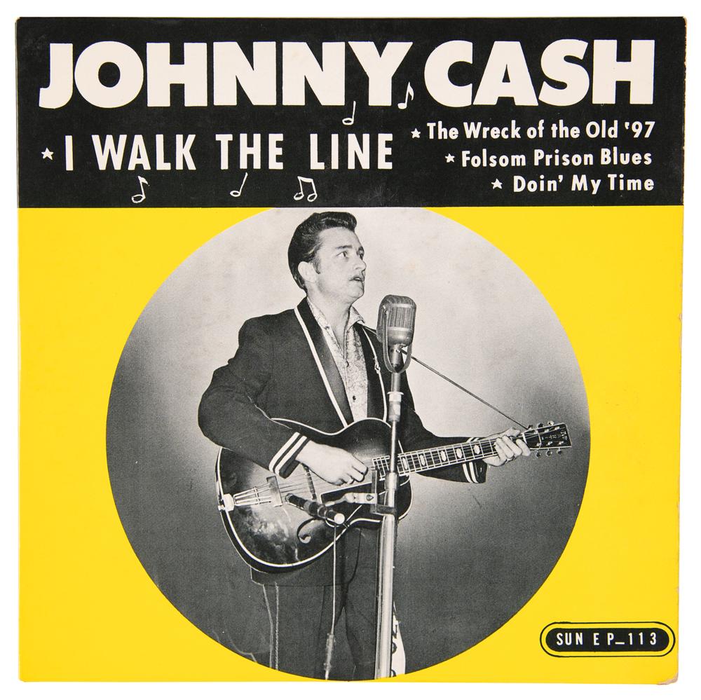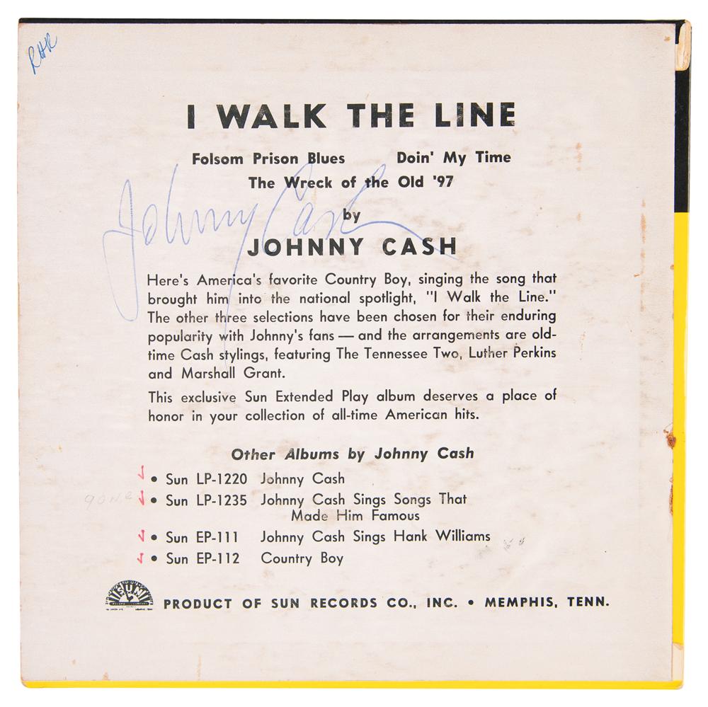 Sun Records (EP-113) 45 RPM record for the Johnny Cash EP ‘I Walk the Line,’ signed on the back cover in blue ballpoint by Cash. The EP contains four songs: ‘Folsom Prison Blues,’ ‘Doin' My Time,’ ‘I Walk the Line,’ and ‘The Wreck of the Old '97.’ This special collection of some of Johnny Cash's earliest and most important recordings was released by Sun Records in 1958. In fine condition, with light scuffing; the original, beautiful picture sleeve is well preserved and in excellent condition with bright graphics. The included record is in VG condition.